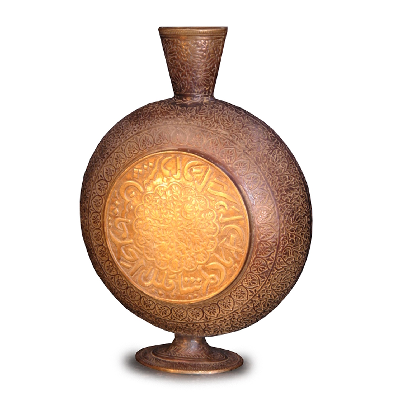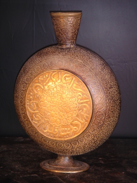 LARGE CIRCULAR CAST BRONZE FLAT VASE WITH NARROW NECK INDIAN 17/i HIGH (X2)