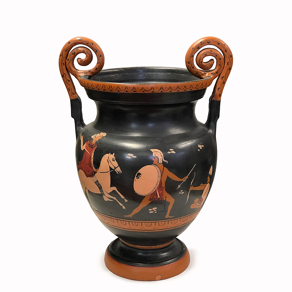 LARGE DECORATED GRECIAN ATTIC VASE VOLUTE KRATER STYLE WITH SPIRAL LOOP TWIN HANDLES 23" HIGH (X3)