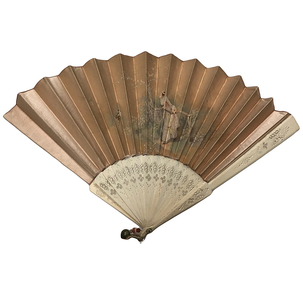 LARGE DECORATIVE FRITTED BONE STICK AND SILK FAN WITH PAINTED FIGURE DECORATION GOLD-PINK 30 CM LONG