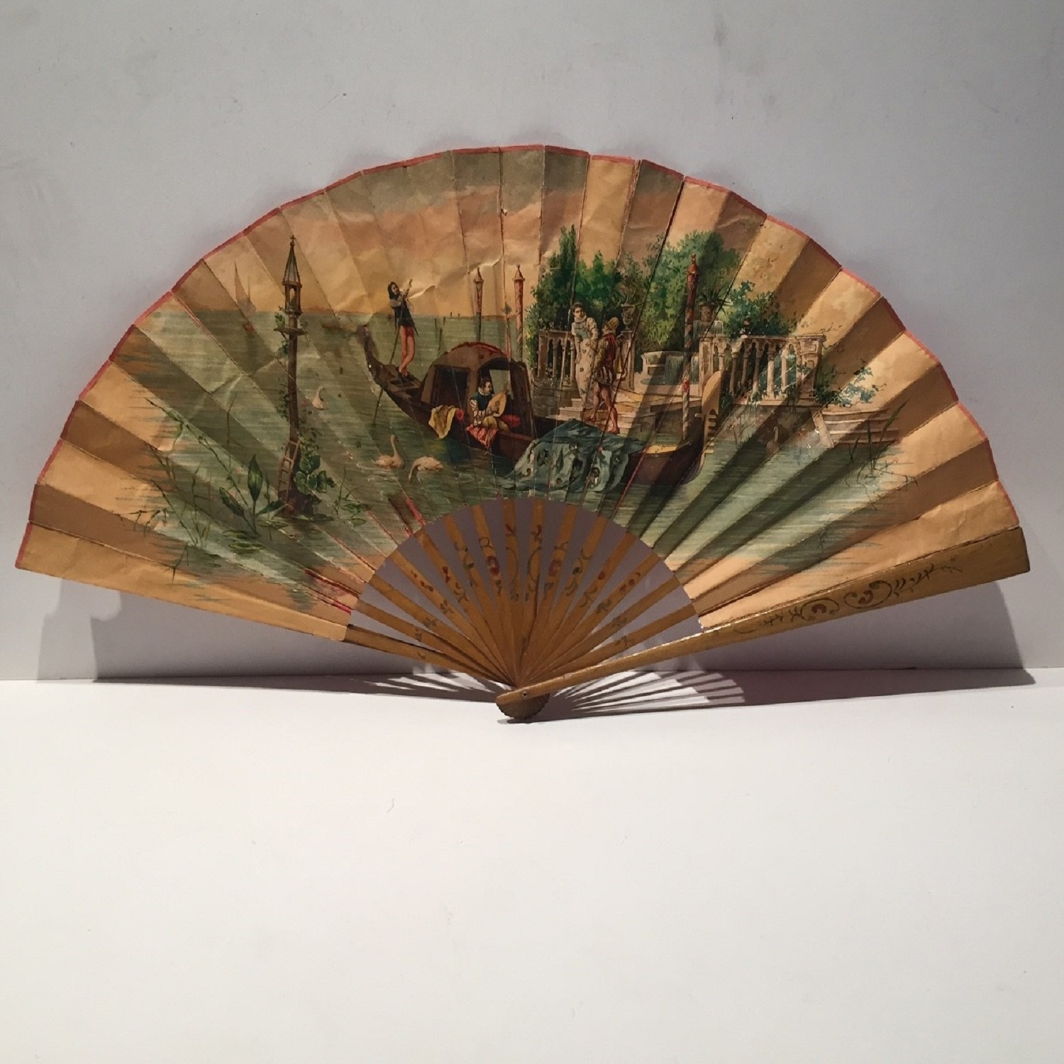 LARGE EDWARDIAN PRINTED PAPER FAN WITH PICTORAL SCENE AND WOODEN STICKS
