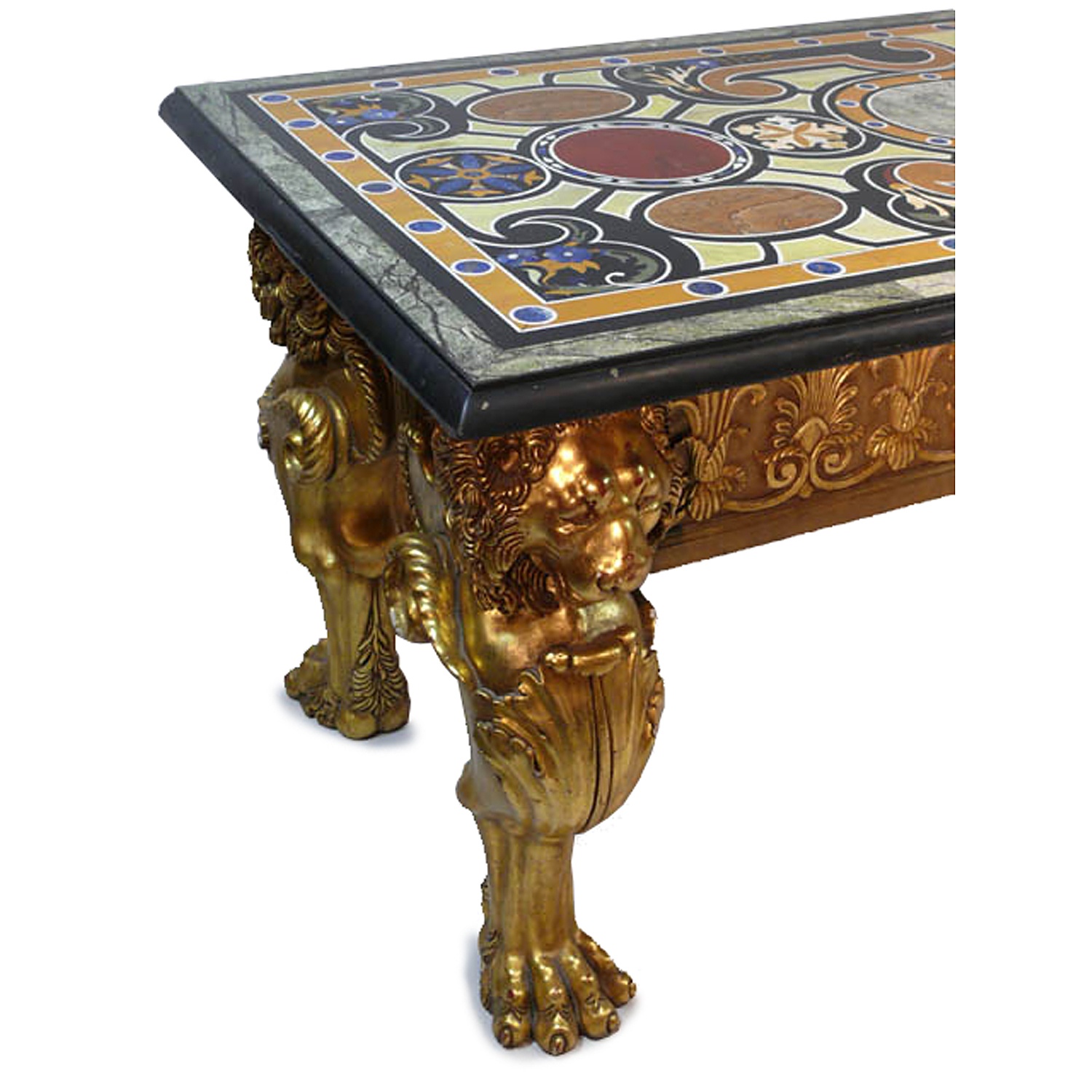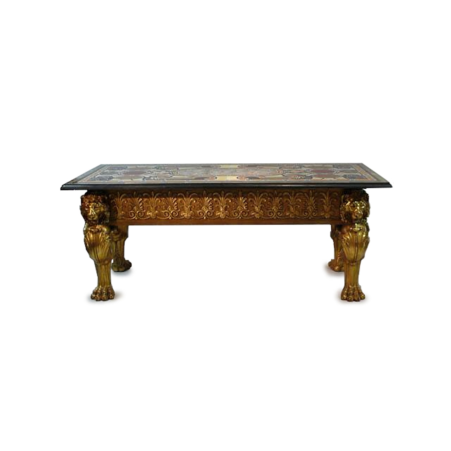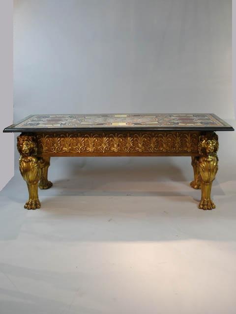 LARGE EMPIRE CARVED AND GILDED NARROW CENTRE TABLE ACANTHUS SIDES LION LEGS WITH FINE PIETRA DURE INLAID MARBLE TOP 6'4/i X 2'8/i 193 CM X 81 CM