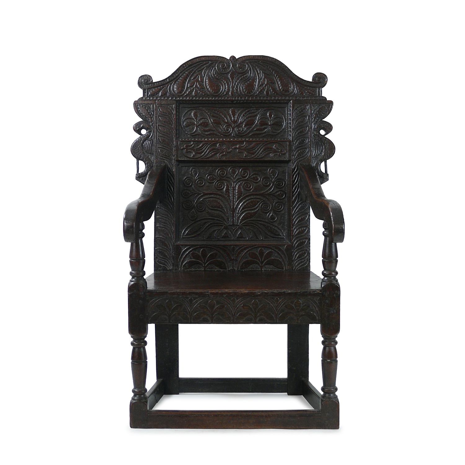 LARGE ENGLISH 17TH CENT WAINSCOT ARMCHAIR ORNATE CARVED OAK THE BACK PANEL WITH STYLISED TREE AND TREFOILED FOLIAGE SEAT RAIL WITH LUNETTE PATTERN 110 CM HIGH 66 CM WIDE 56 CM DEEP