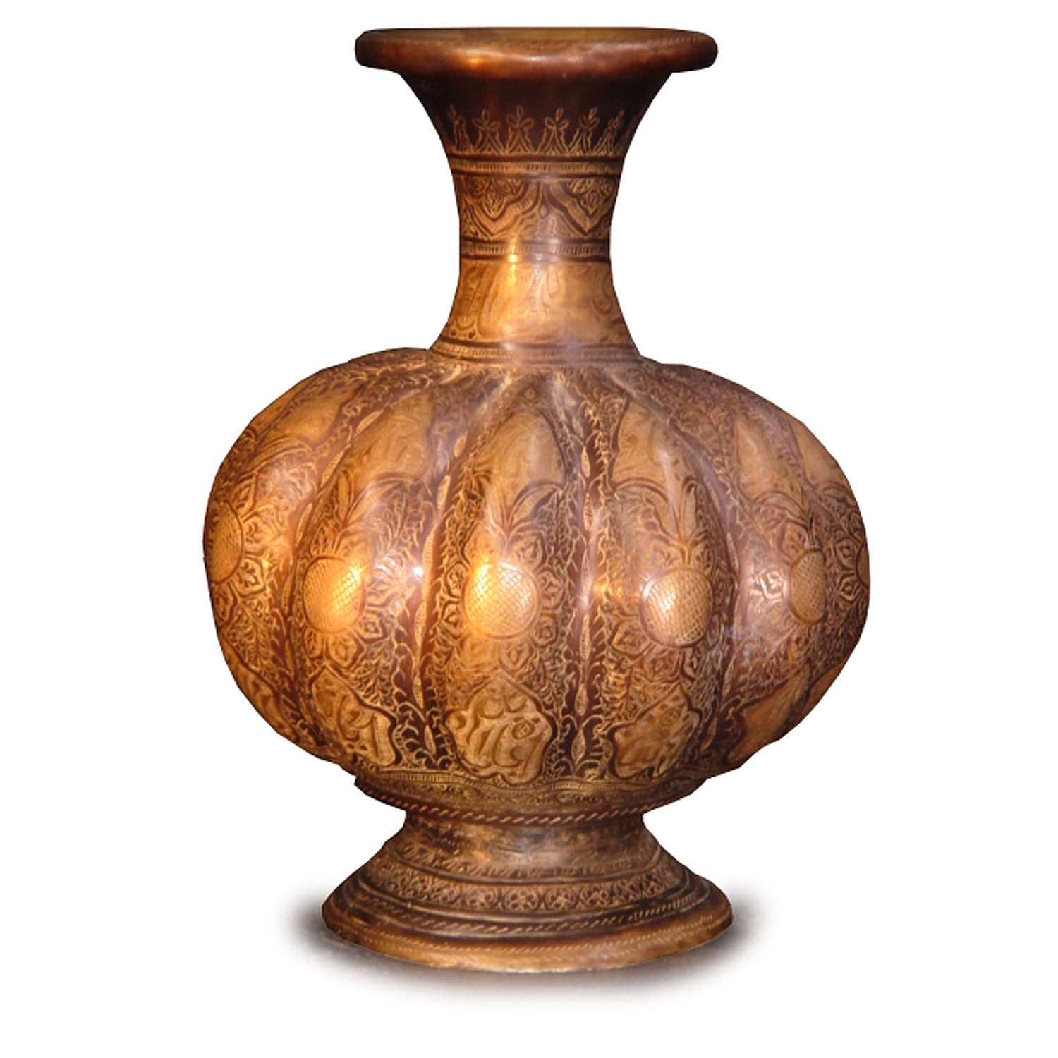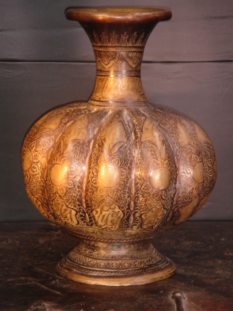 LARGE ENGRAVED BRONZE MOGHUL PUMPKIN SHAPED VASE WITH TRUMPET NECK 16/i HIGH (X2)
