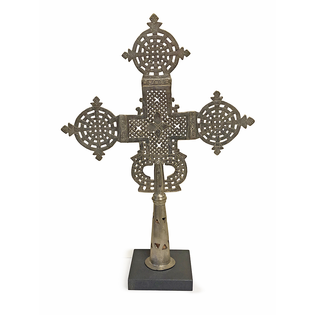 LARGE ETHEOPIAN SILVER CUSIFIX / CROSS MOUNTED ON A MODERN EBONISED BASE 50 CM HIGH 36 CM WIDE