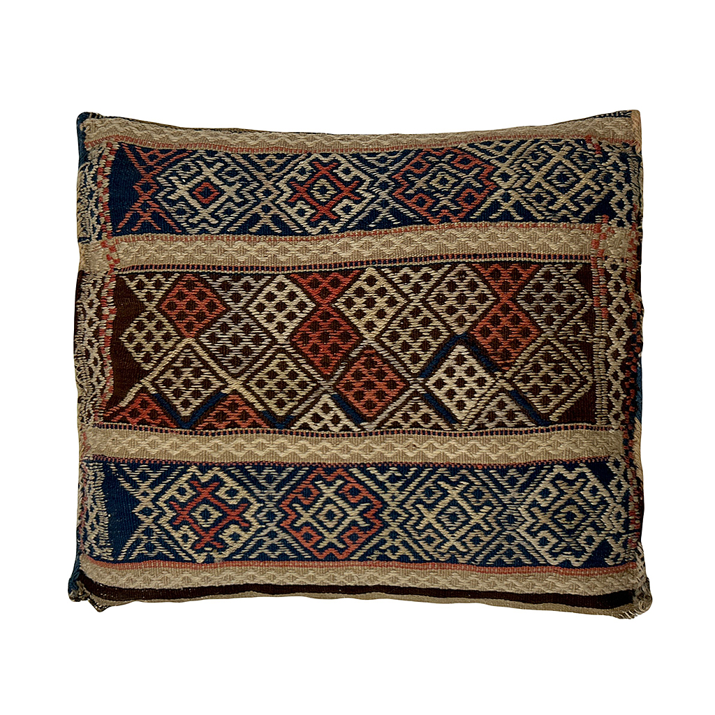 LARGE ETHNIC / CARPET CUSHION RED - BLUE - CREAM STRIPE AND GEOMETRIC DESIGN 62 CM X 53 CM