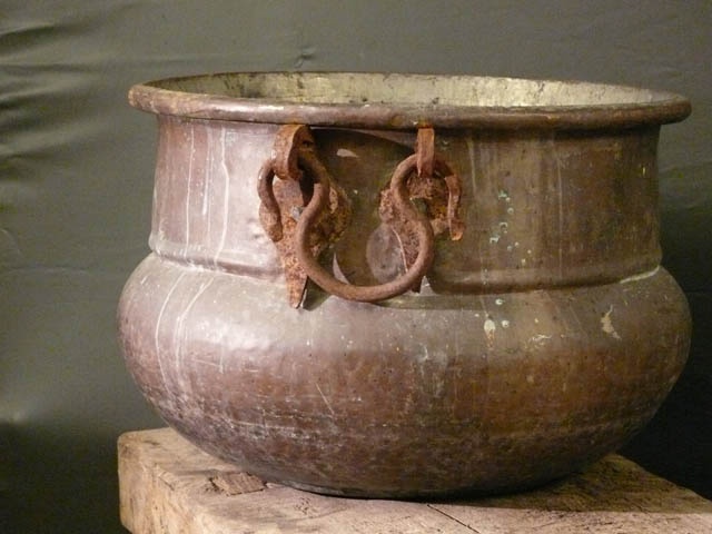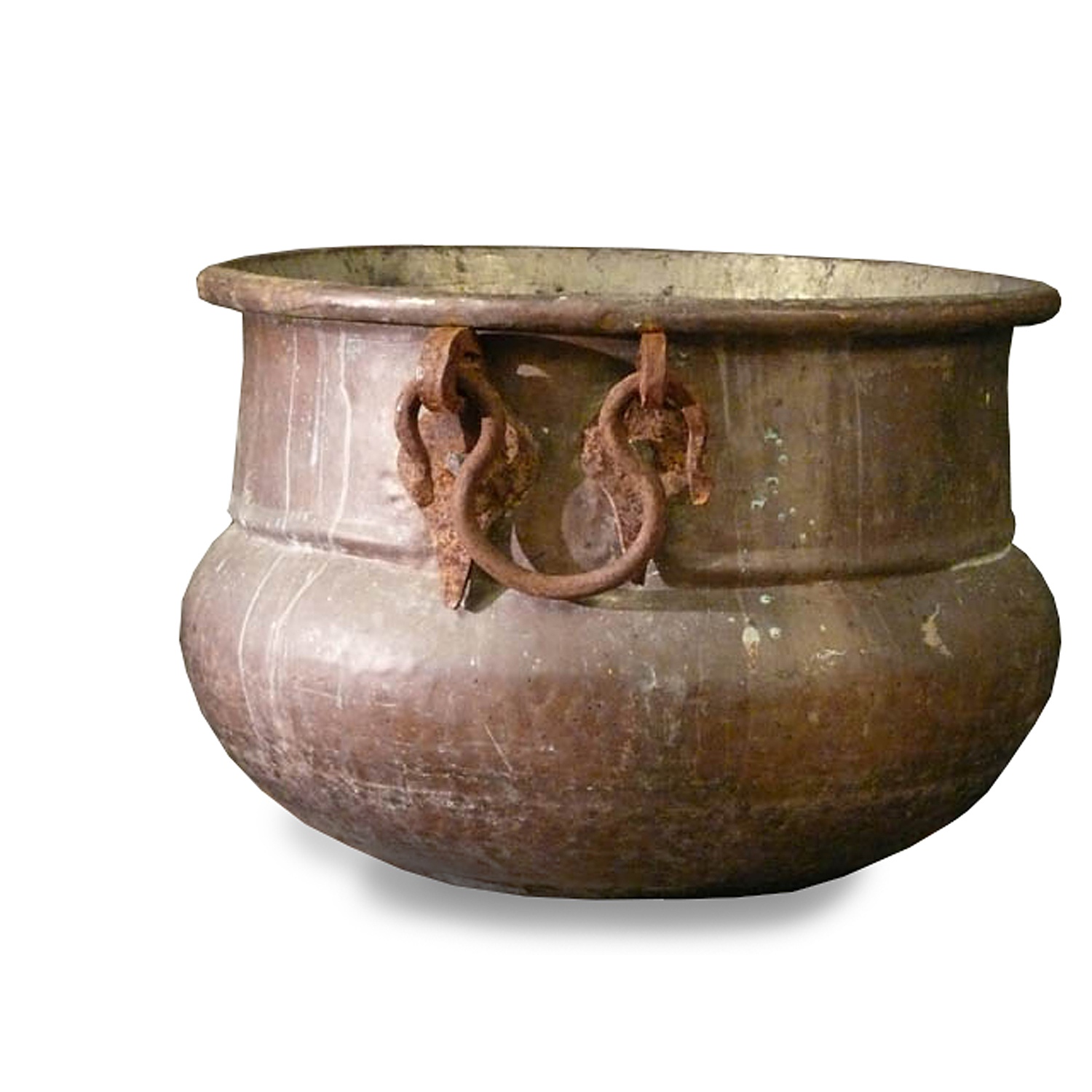 LARGE ETHNIC COPPER POT WITH TWIN IRON HANDLES 47 CM DIAM.