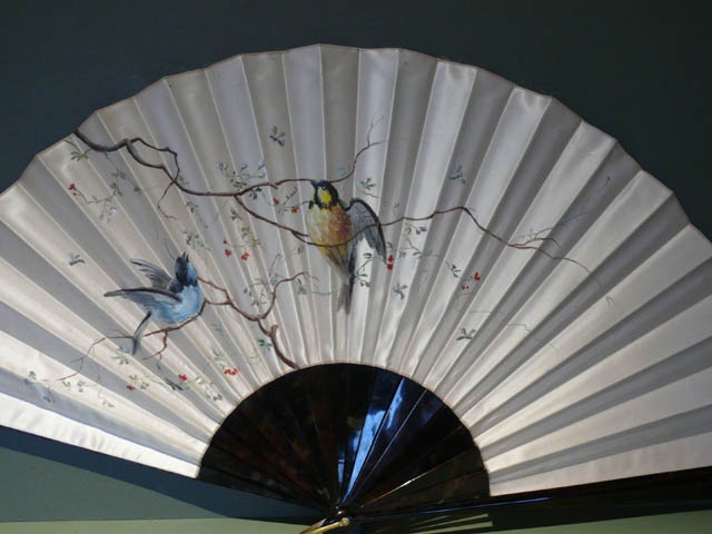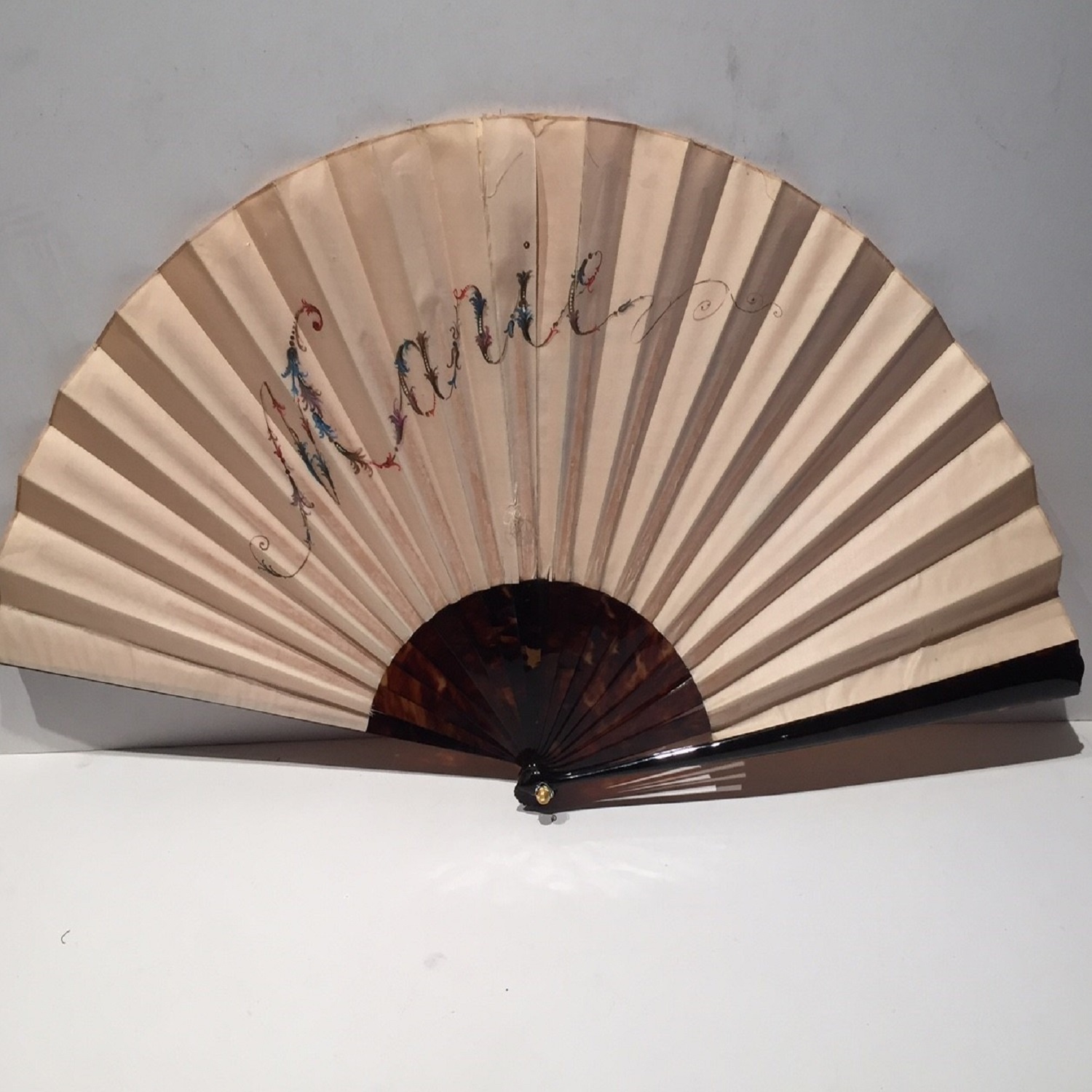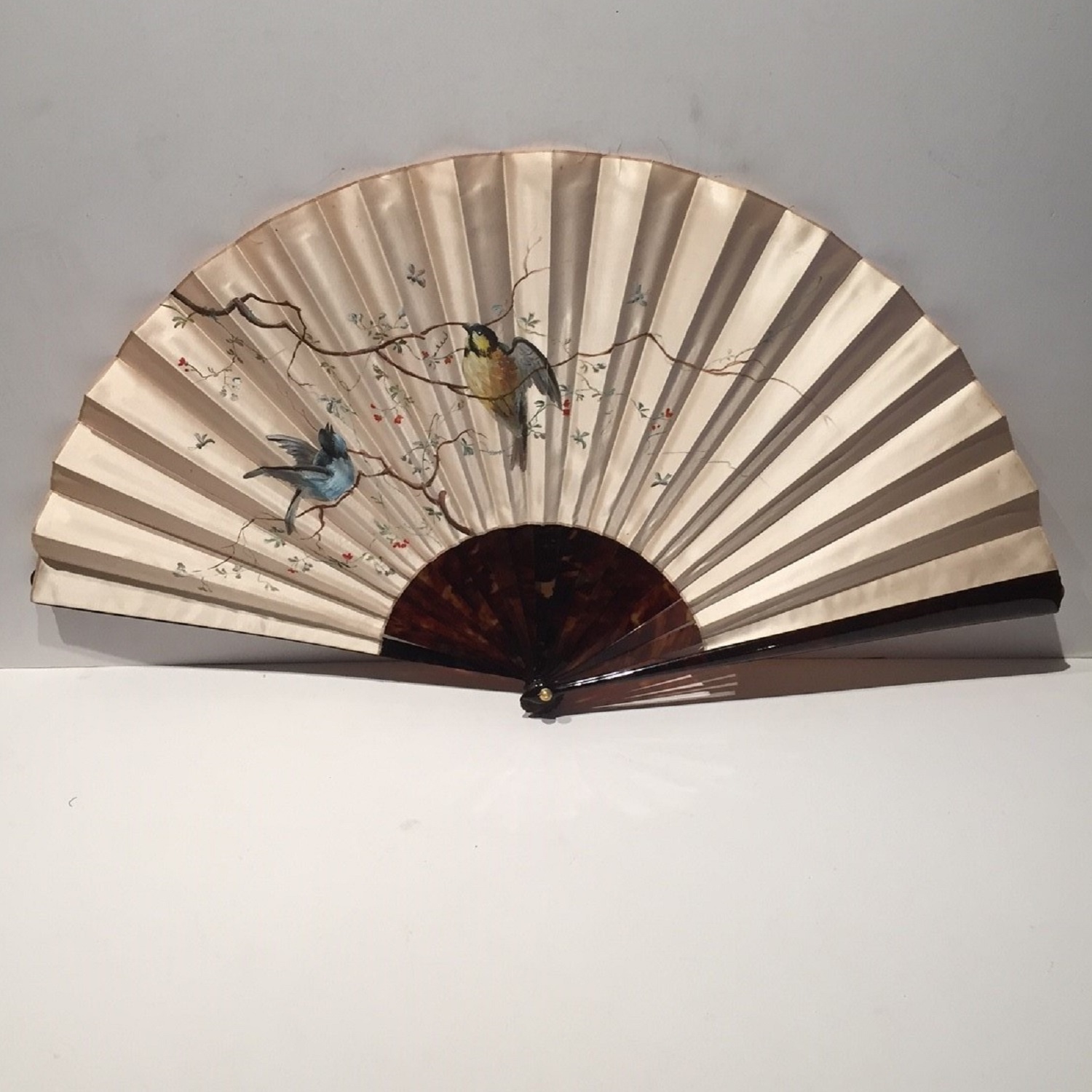 LARGE FAN PAINTED SILK WITH TORTOISESHELL STICKS BIRD DESIGN REVERSE MONOGRAMMED WITH /iMARIE/i 35 CM