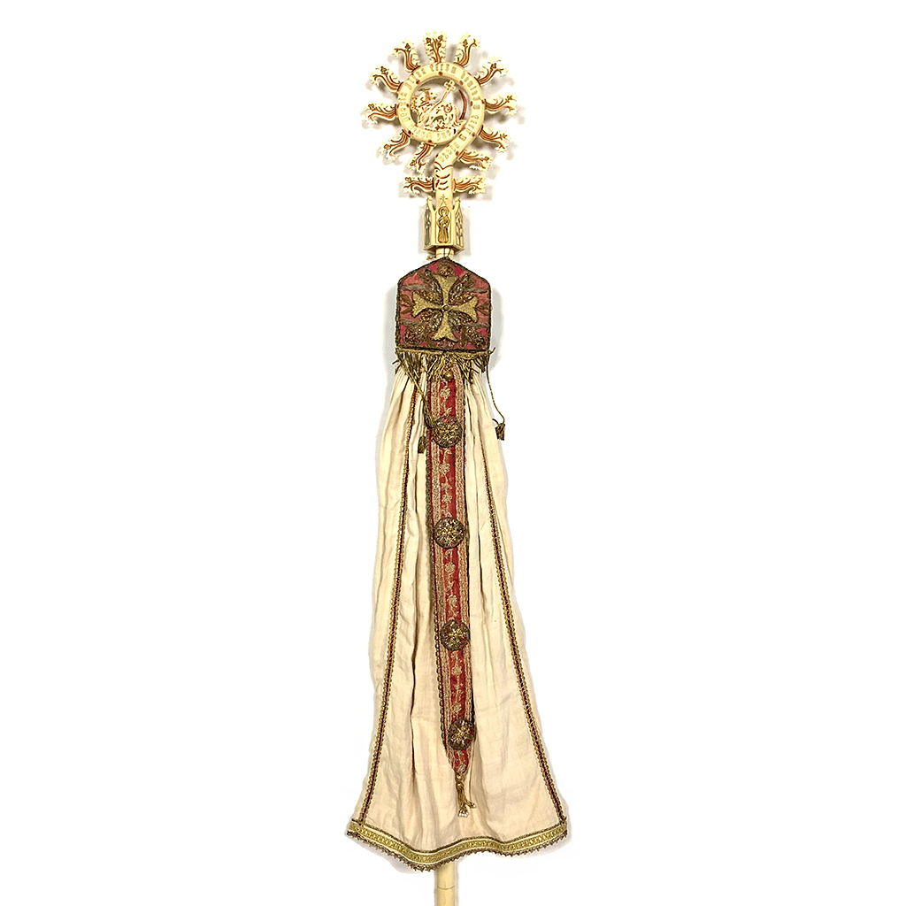 LARGE FAUX IVORY PROCESSIONAL STAFF / SCEPTRE WITH SPIRAL GOLD PAINTED FINIAL WITH CENTRAL LION DESIGN AND HANGING BANNER WITH METALLIC EMBROIDERED CROSS AND BRAID ON CREAM LINEN 205 CM TALL
