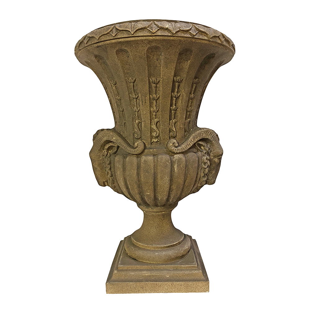 LARGE FAUX STONE CLASSICAL GARDEN URN FLUTED WITH RAMS HEAD DECORATION 100 CM HIGH 69 CM WIDE 69 CM DEEP THE 41 CM X 41 CM (X6)