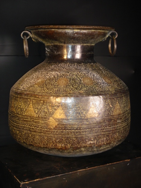LARGE FINE ENGRAVED BRONZE MOGHUL VASE WITH RING HANDLES