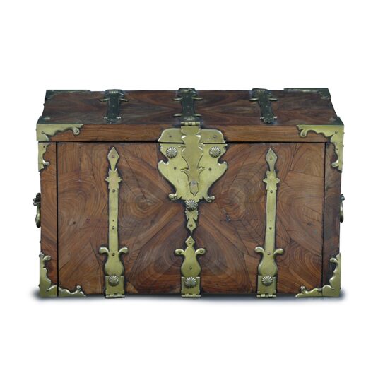 LARGE FRANCO - FLEMISH STRONGBOX KINGWOOD WITH ORNATE BRASS STRAPING AND HANDLES 17TH CENT 26 CM HIGH 45 CM WIDE 28 CM DEEP