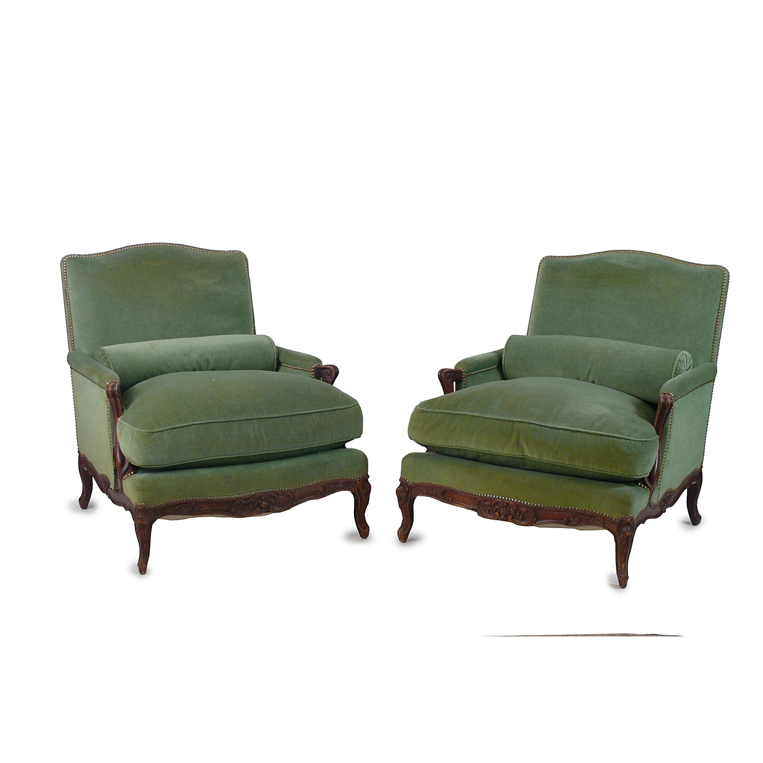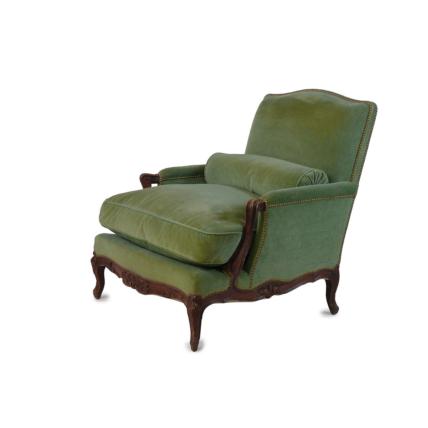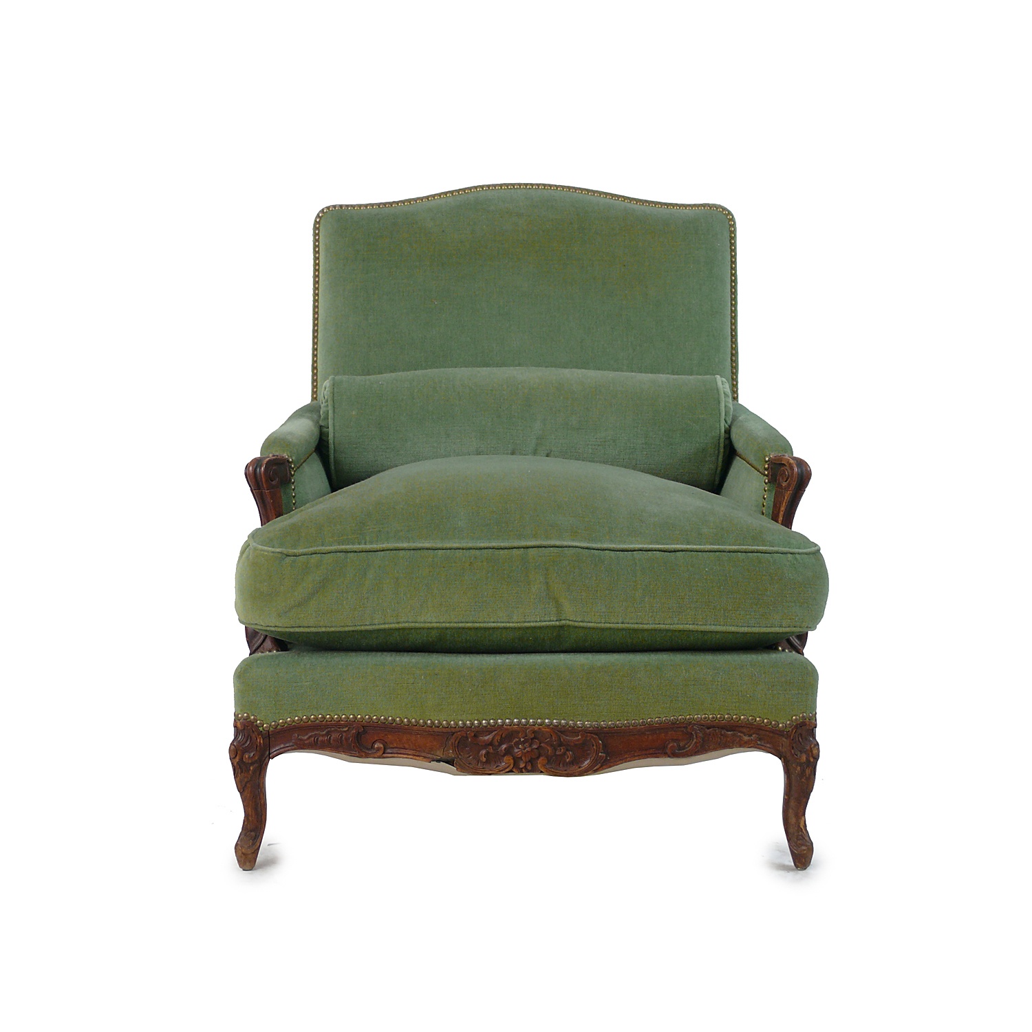 LARGE FRENCH ARMCHAIR WITH CELADON GREEN VELVET UPHOLSTERY CUSHION AND BOLSTER 88 CM HIGH 93 CM DEEP 77 CM WIDE (X2)