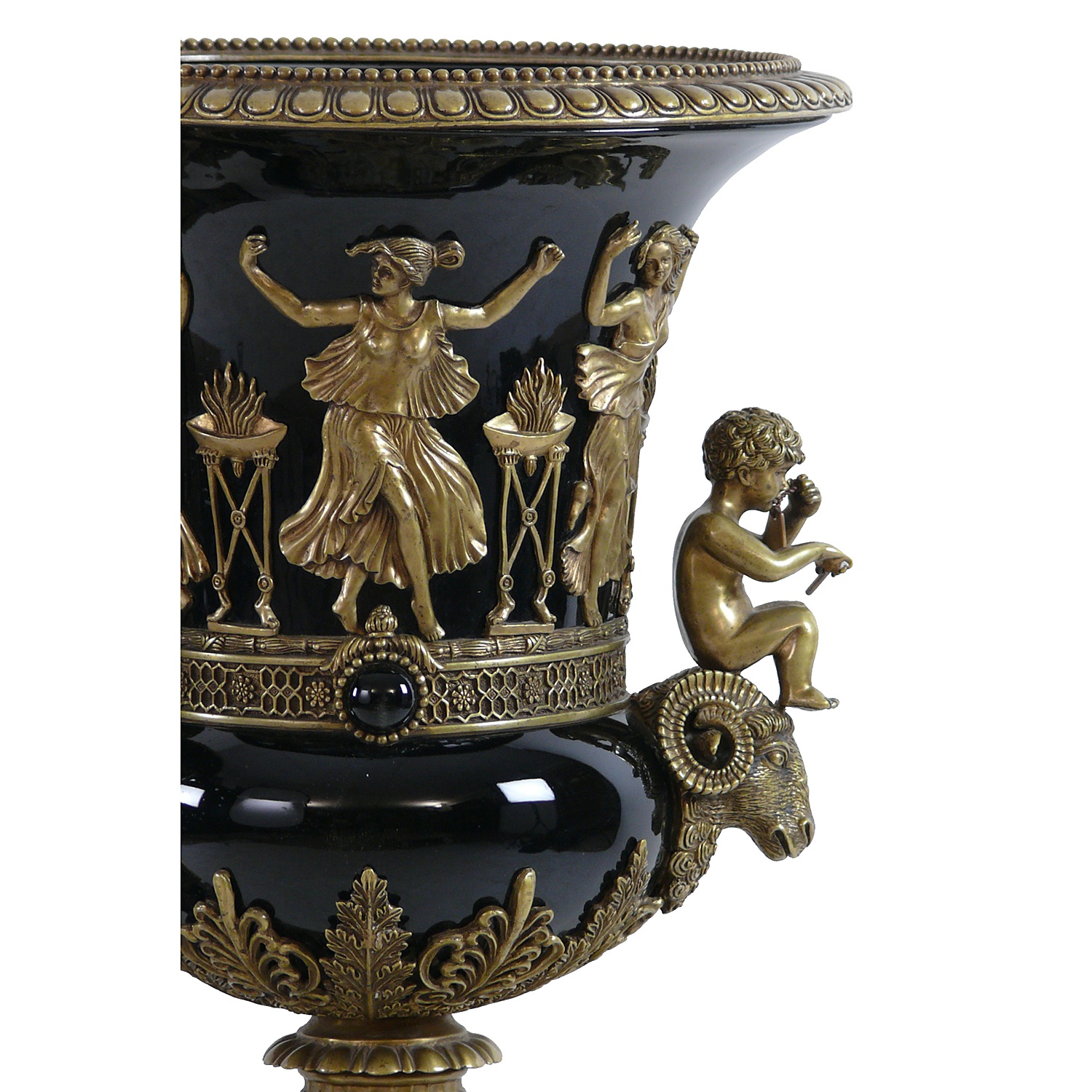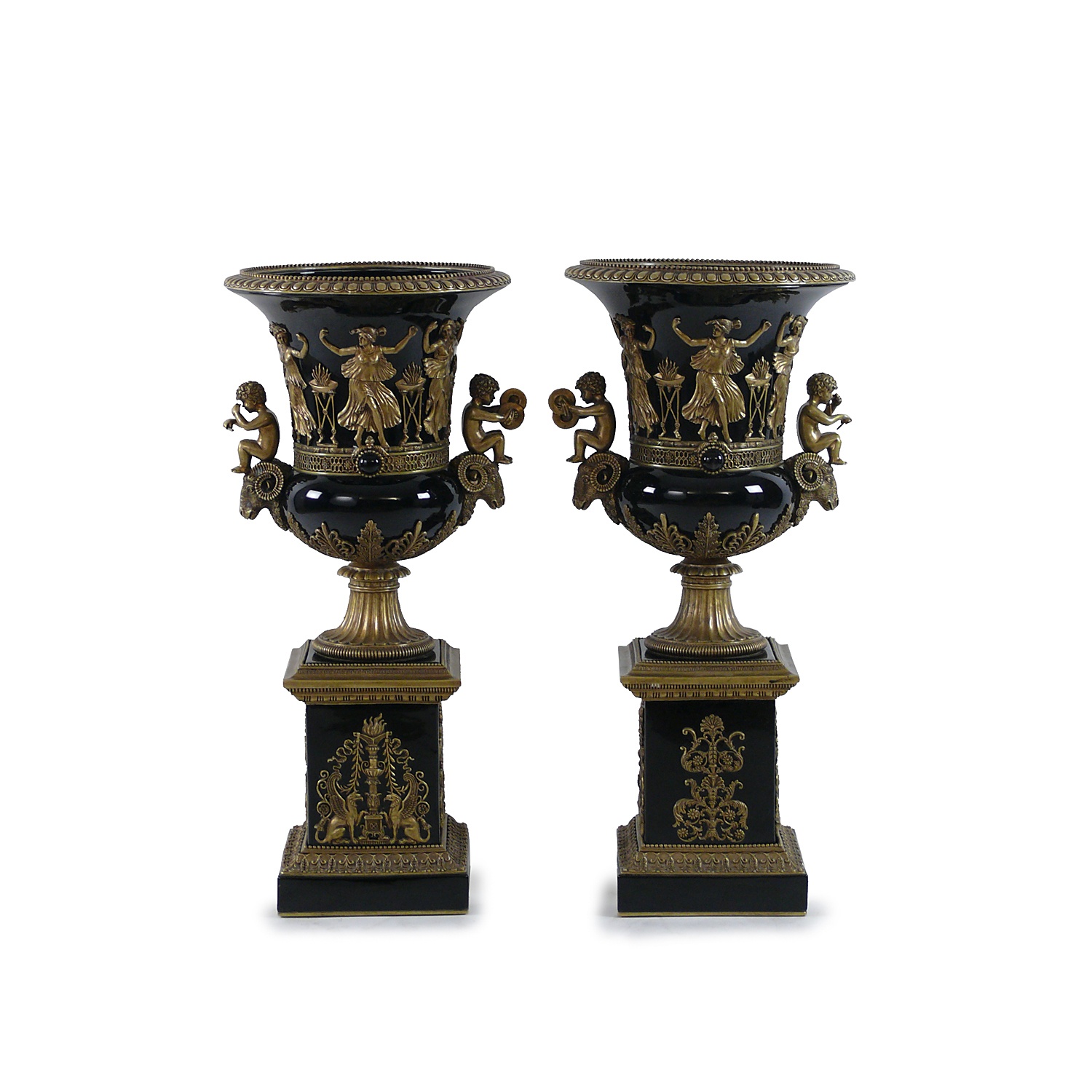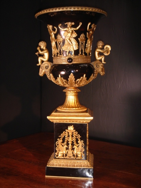 LARGE FRENCH BLACK CERAMIC CLASSICAL URN WITH ORMOLU RAM AND CHERUB MOUNTS THOMIRE STYLE 29/i HIGH (X2)