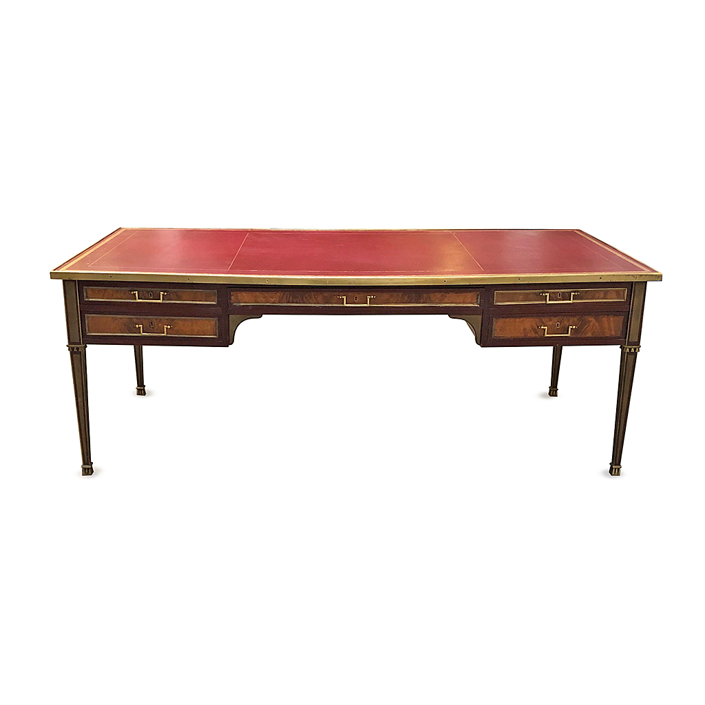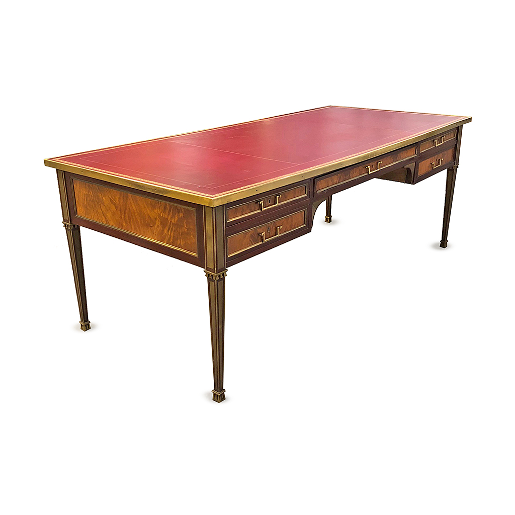 LARGE FRENCH BUREAU PLAT WRITING TABLE / DESK MAHOGANY WITH BRASS MOUNTS AND A RED TOOLED LEATHER TOP LOUIS XVI STYLE CIRCA 1950 75 CM HIGH 201 CM WIDE 91 CM DEEP