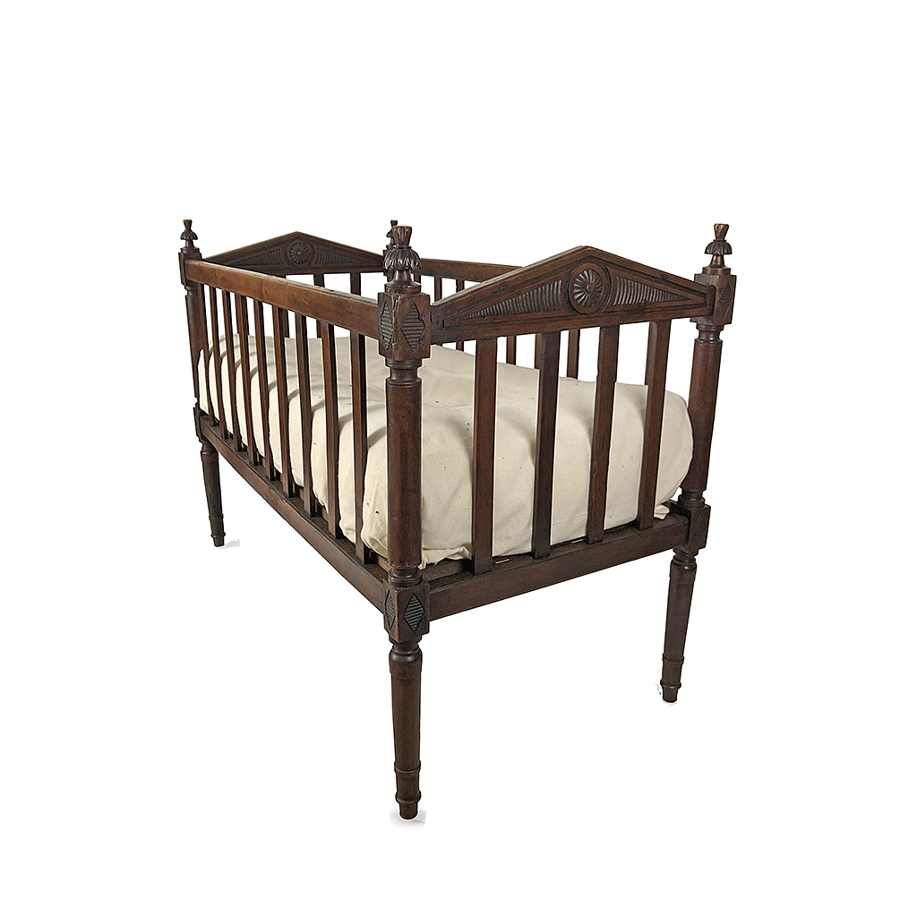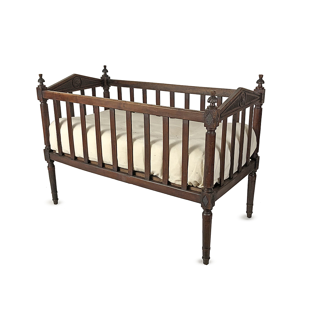LARGE FRENCH COT BED CARVED DARK FRUITWOOD WITH SLATTED SIDES PLUS MATTRESS CIRCA 1890 83 CM HIGH 114 CM LONG 58 CM WIDE