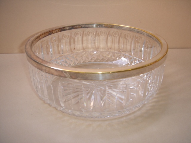 LARGE FRENCH CUT GLASS FRUIT BOWL WITH SILVER RIM