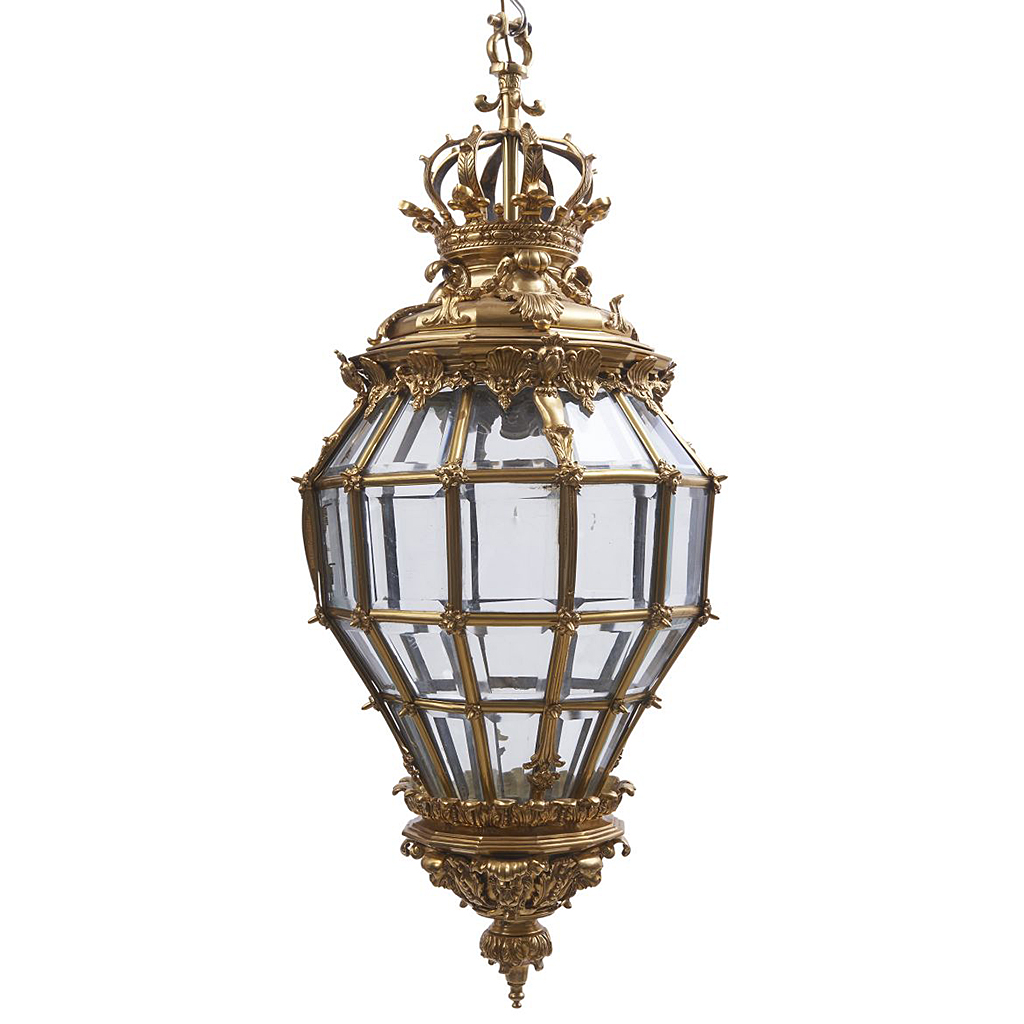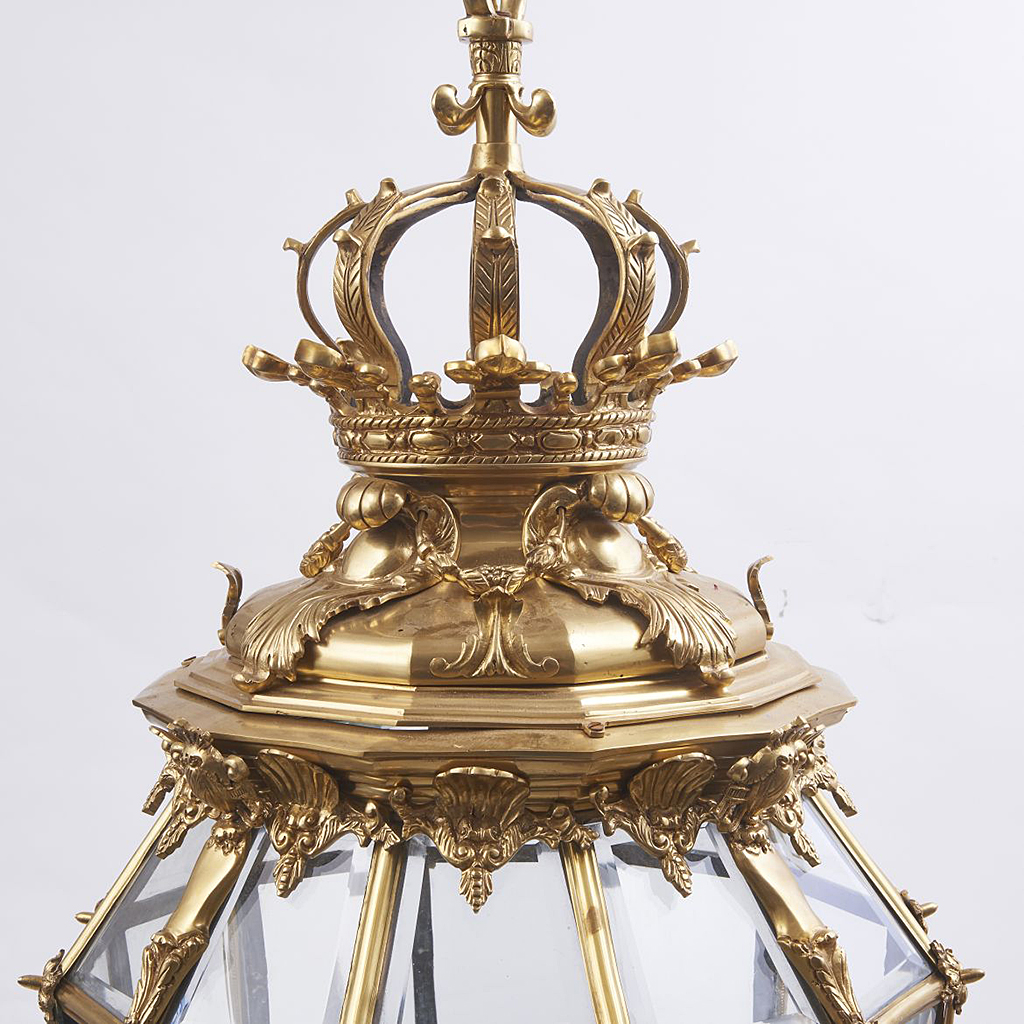 LARGE FRENCH GILT BRONZE VERSAILLES LANTERN WITH CORONA TOP AND BEVELLED GLASS PANELS LOUIS XIV STYLE 120 CM HIGH 45 CM DIAM