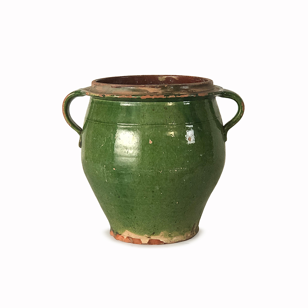 LARGE FRENCH GREEN GLAZED STORAGE JAR WITH TWIN LOOP HANDLES 30 CM HIGH