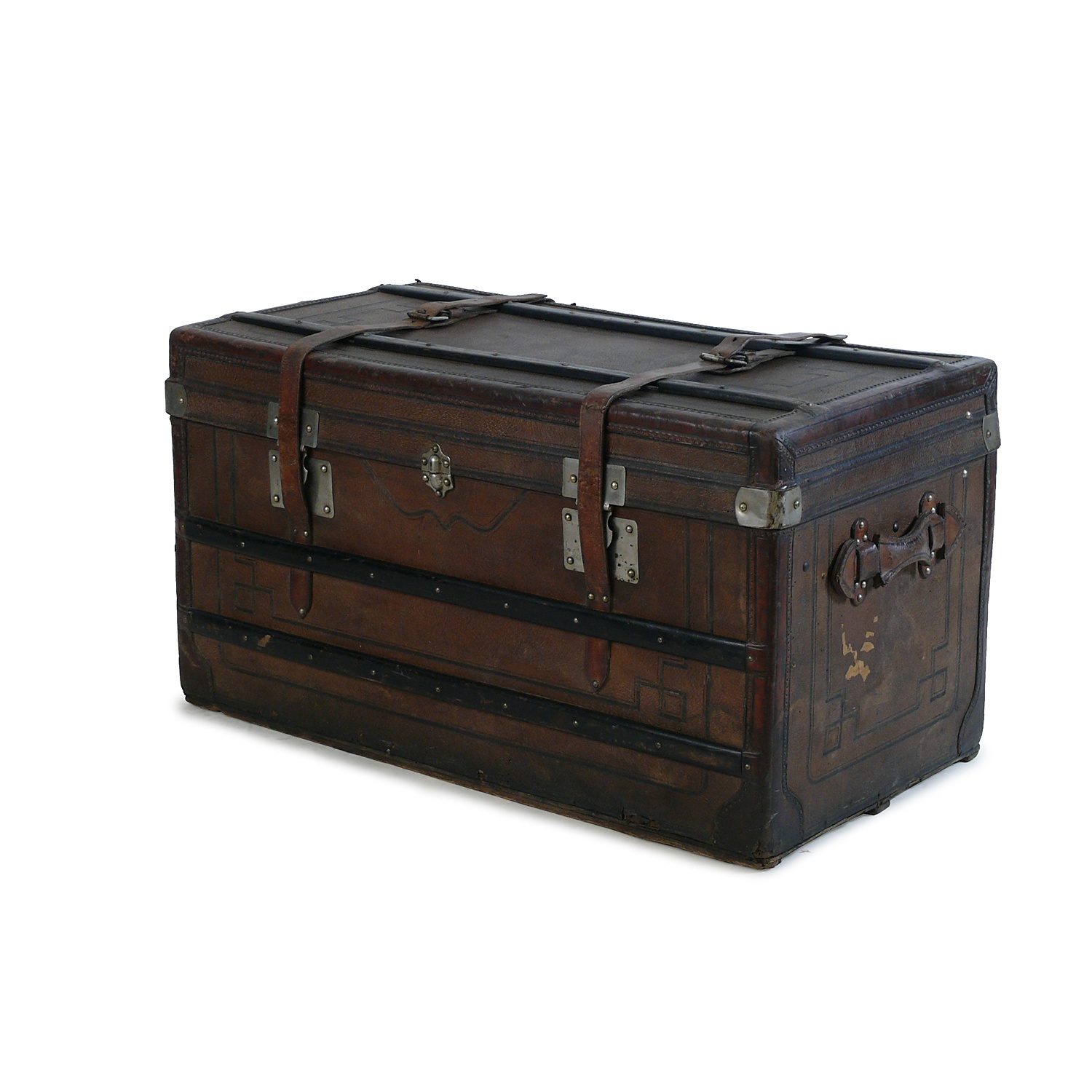 LARGE FRENCH TRUNK TOOLED TAN LEATHER WITH STRAPS BREVETES CIRCA 1870 88 CM LONG 48 CM HIGH 48 CM DEEP