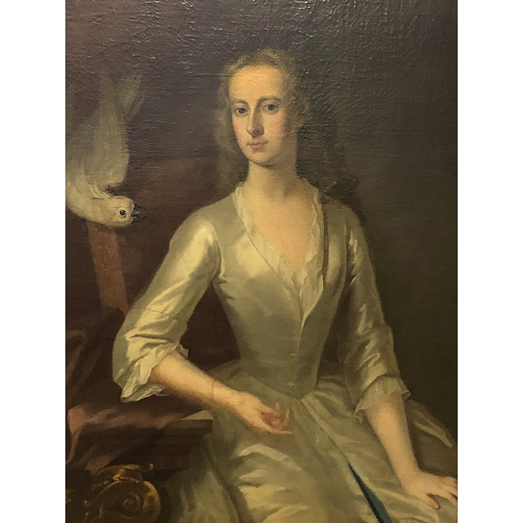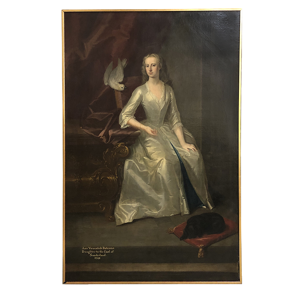 LARGE FULL LENGTH PORTRAIT OF ANNE VICOUNTESS BATEMAN WEARING A WHITE SATIN DRESS A WHITE COCKATOO PERCHED ABOVE HER SHOULDER DATED 1730 ENOCH SEEMAN (1694-1745) IN A HEAVY OAK OR THIN GILT FRAME 94 INCHES X 60 INCHES
