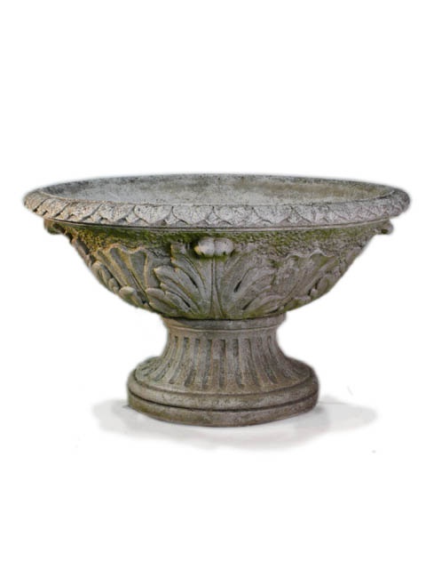 LARGE GARDEN URN OVAL STONE CAMPANA SHAPED WITH ACANTHUS RELIEF ON FLUTED PEDESTAL BASE 60 CM HIGH 100 CM WIDE 66 CM DEEP (X5)