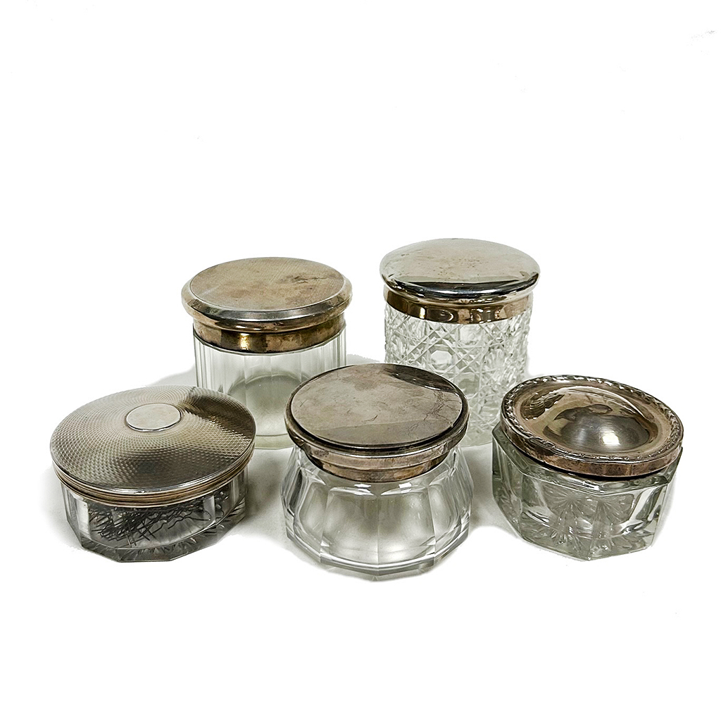 LARGE GLASS TOILET POT / JAR WITH PLAIN / LIGHT DECORATIVE SILVER LID