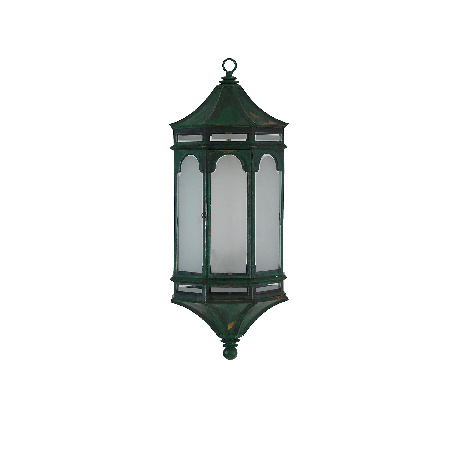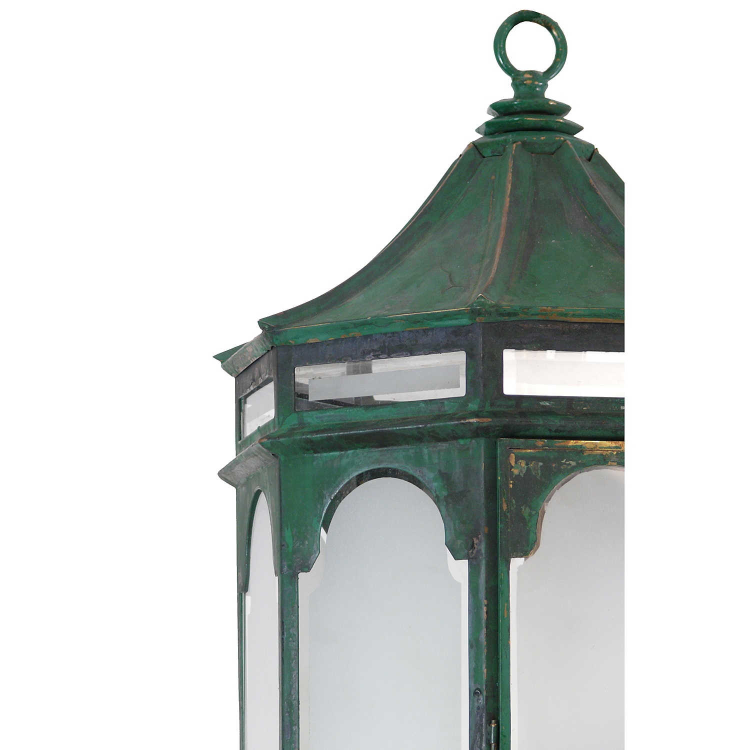 LARGE GREEN / BRASS LANTERN HEXAGONAL WITH FROSTED GLASS PAGODA SHAPED TOP AND BOTTOM 93 CM HIGH 36 CM WIDE (X4)