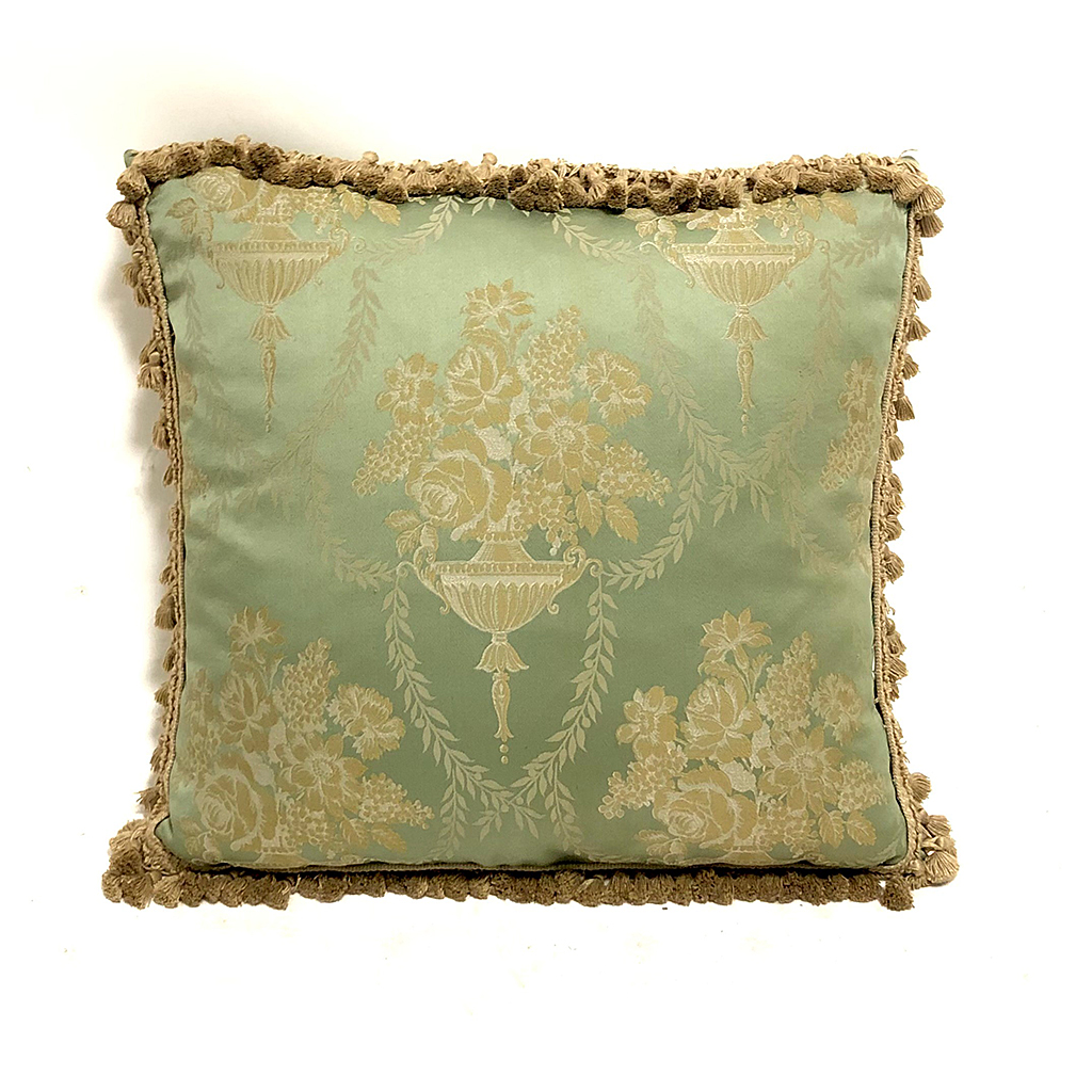 LARGE GREEN SILK DAMASK CUSHION ERN AND FLOWER DESIGN WITH TASSEL FRINGING 55 CM X 50 CM (X2)