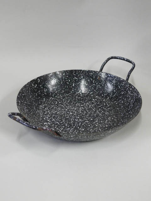 LARGE GREY SPECKLED ENAMEL TWO HANDLE PAELLA / SAUCEPAN