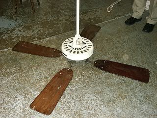 LARGE INDIAN WHITE PAINTED CEILING FAN WITH WOOD BLADES ELEC.FULL PRAC.220 VOLT 4'5/i WIDE 3'9/i HIGH 36KG (X2)