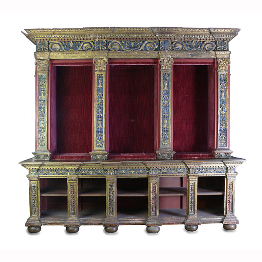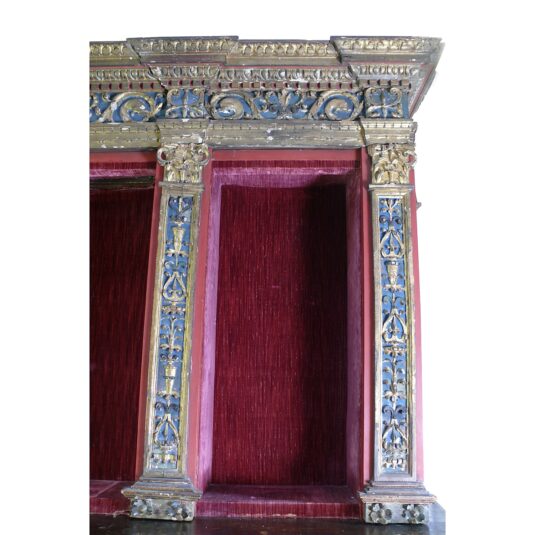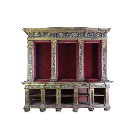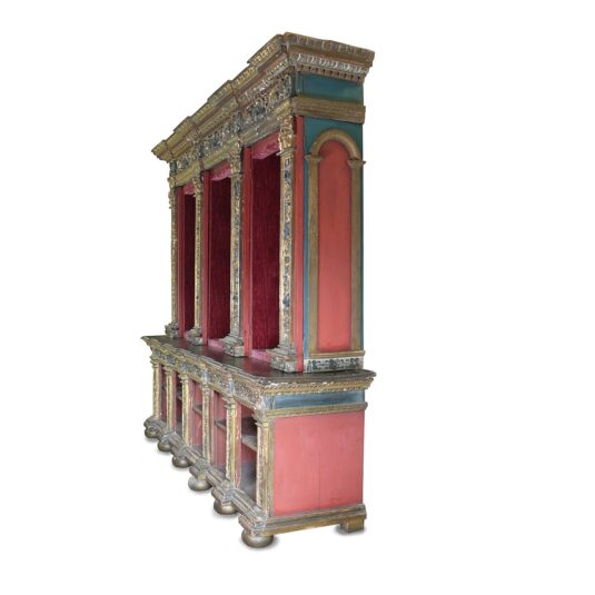 LARGE ITALIAN BOOKCASE ORNATE CARVED GILDED AND DECORATED FLORENTINE EARLY 17TH CENT 232 CM HIGH 253 CM WIDE 59 DEEP