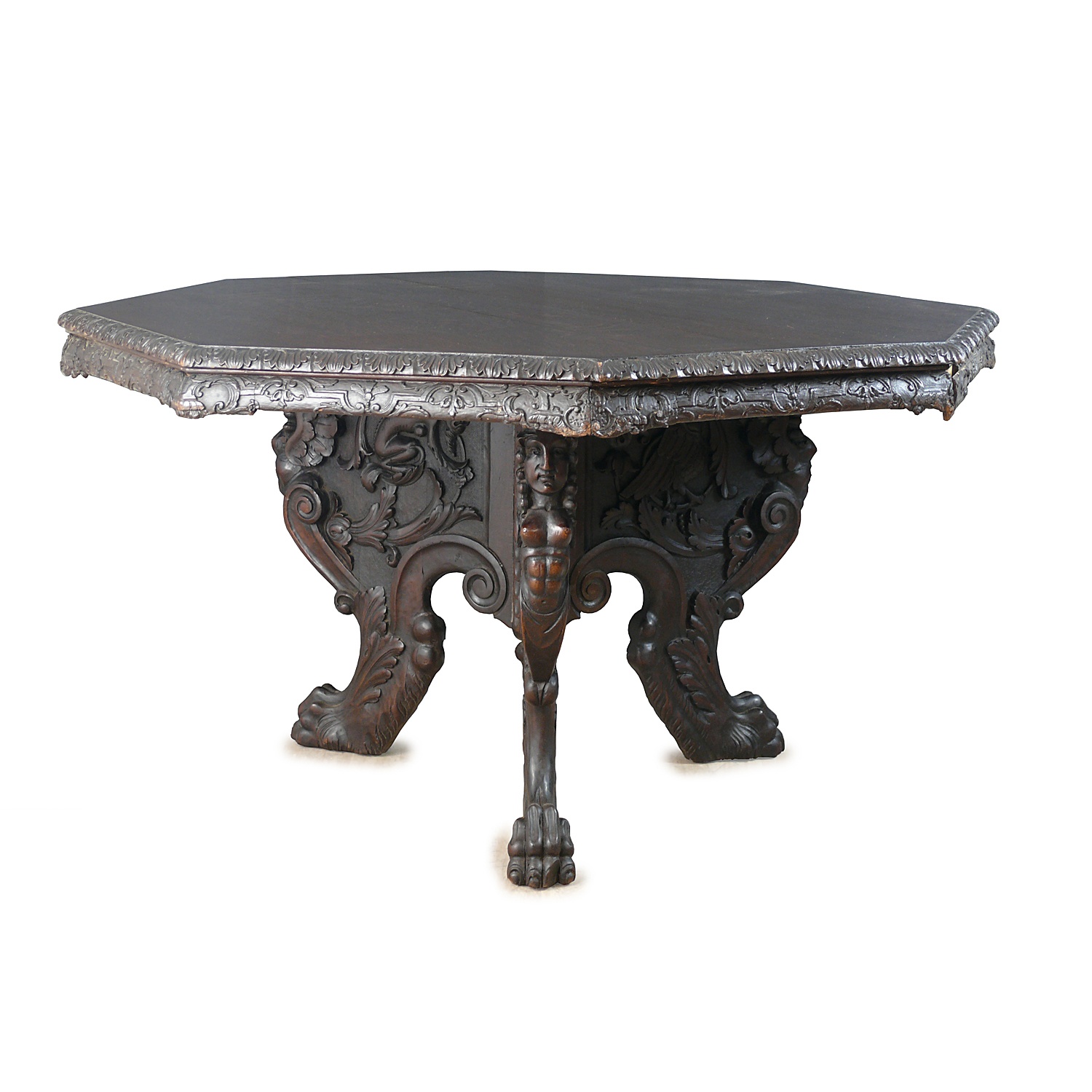 LARGE ITALIAN CENTRE TABLE ORNATE CARVED WALNUT HEXAGONAL TOP ON SCROLLING TRIFORM BASE SPHINX CARYATIDS TERMINATING IN LION PAW FEET 17TH CENT STYLE 74 CM HIGH 130 CM WIDE