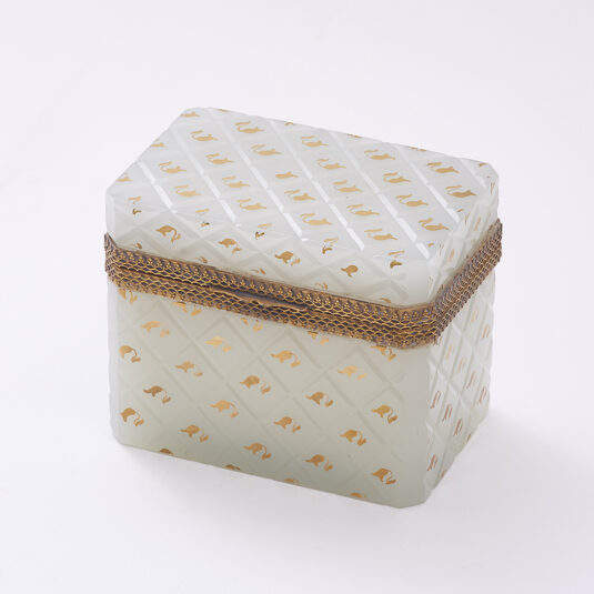 LARGE ITALIAN OPAQUE WHITE GLASS CASKET / BOX DIAMOND CUT DESIGN WITH FLORAL GILT DECORATION AND FILIGREE GILT METAL MOUNTS EARLY 20TH CENT 10 CM HIGH 13 CM WIDE 8.5 CM DEEP