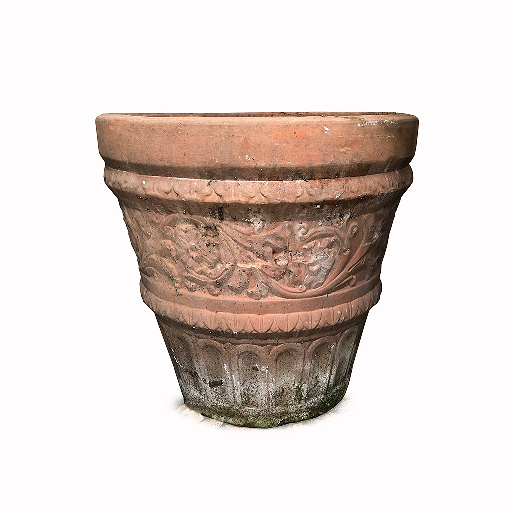 LARGE ITALIAN TERRACOTTA GARDEN URN ETRUSCAN RELIEF PATTERN (X4) NOT FOR HIRE