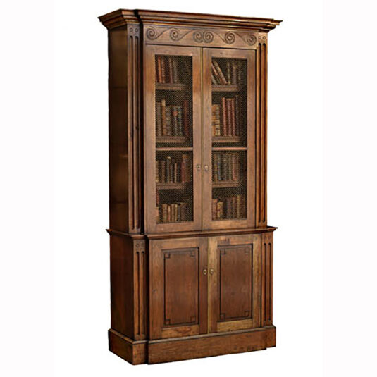 LARGE ITALIAN TUSCAN CARVED WALNUT BOOKCASE WITH BRASS GRILL FRONT AND PANELLED CUPBOARD BASE SCROLL WORK PEDIMENT 8'10/i HIGH X 4'6/i WIDE (X2)