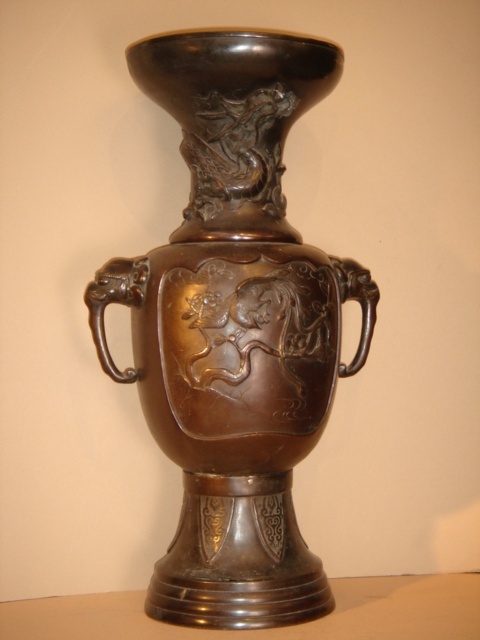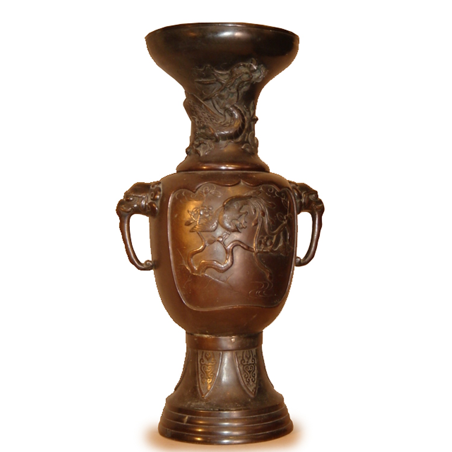 LARGE JAPANESE BRONZE VASE ELEPHANT LOOP HANDLES AND DRAGON RELIEF NECK MEIJI PERIOD 61 CM HIGH