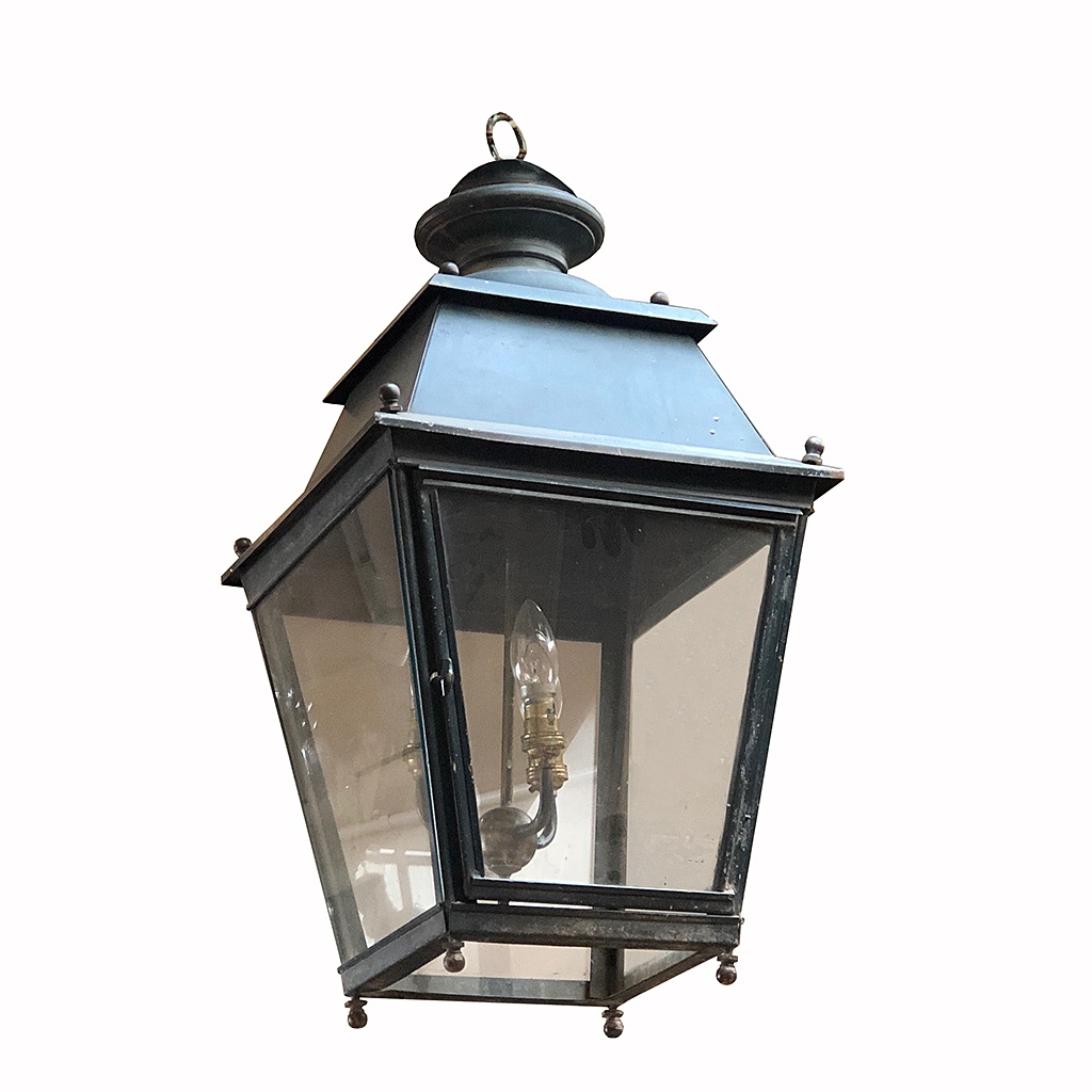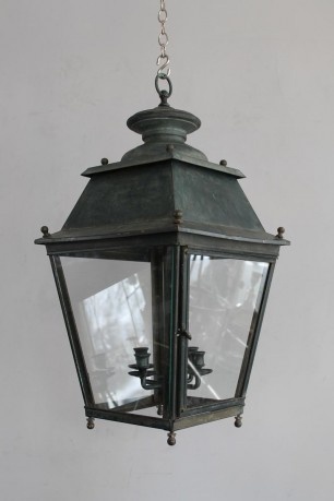 LARGE LANTERN BRONZE / VERDIGRIS FINISH FRENCH 20TH CENT. WITH MAKERS MARK 74 CM HIGH 36 CM WIDE (X2)