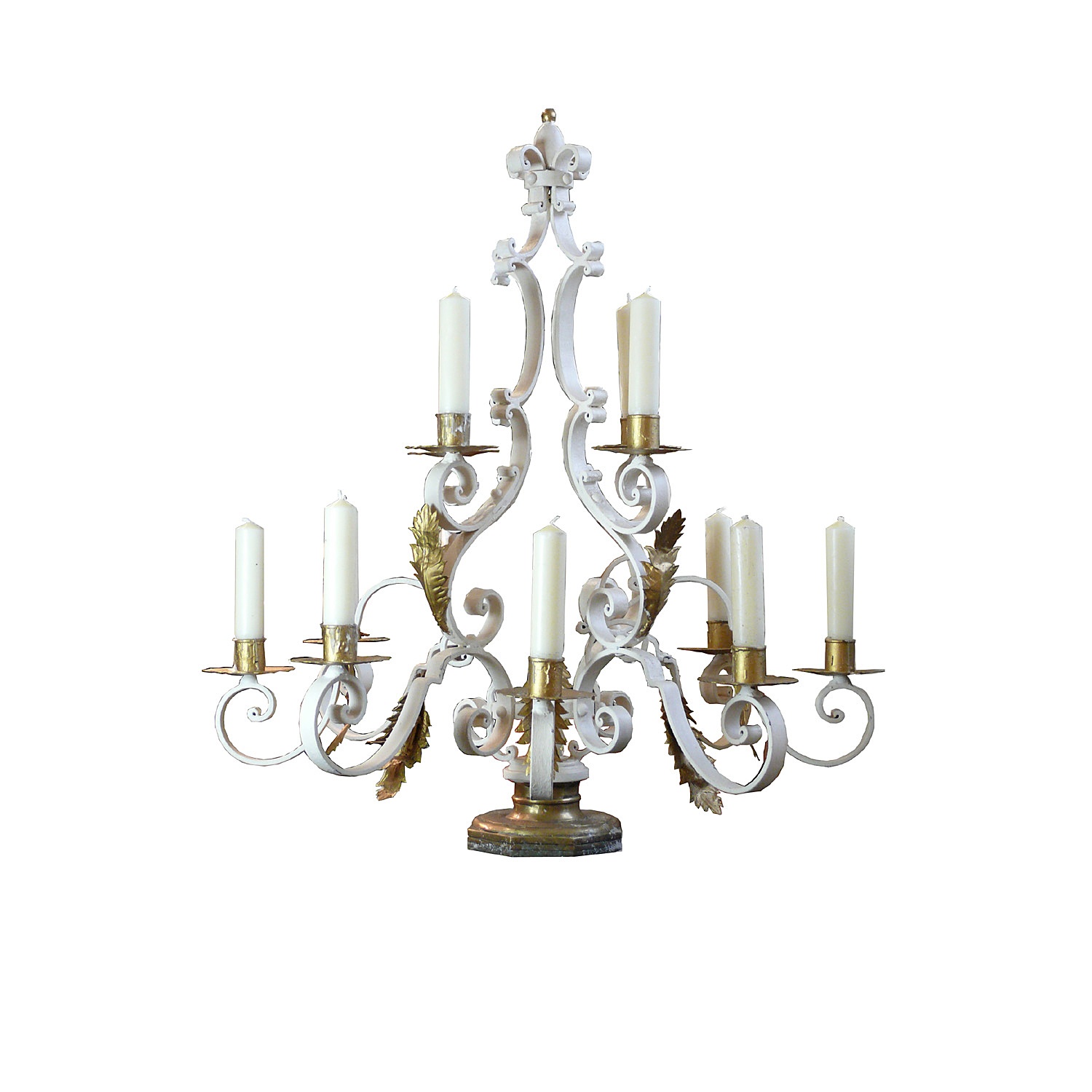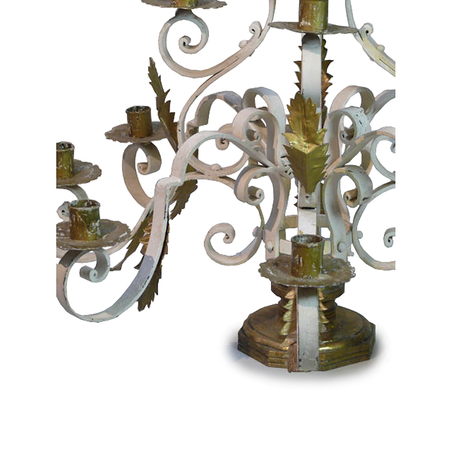 LARGE LOUIS XIV STYLE CANDELABRA CREAM PAINTED WROUGHT IRON WITH BRASS HEXAGONAL BASE AND GILT LEAF MOUNTS 12 LIGHT 29 KG 97 CM HIGH 87 CM WIDE (X6)