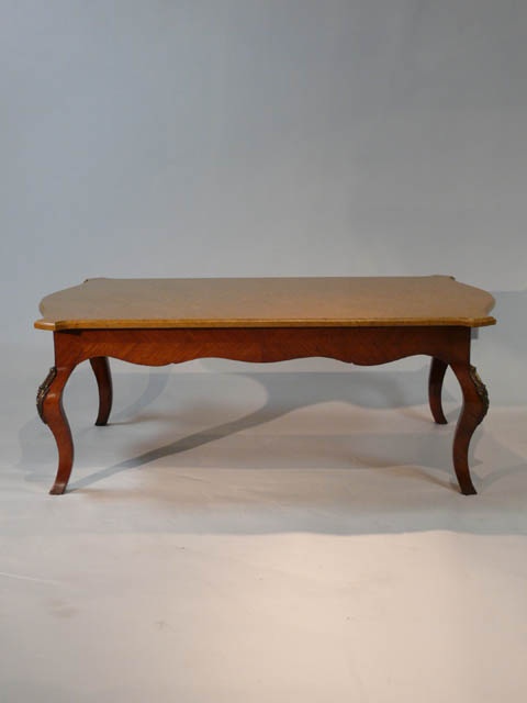 LARGE LOUIS XV SERPENTINE KINGWOOD COFFEE TABLE QUARTER VENEERED WITH SHAPED AMBER MARBLE TOP AND ORMOLU MOUNTS 47 CM HIGH 125 CM WIDE 75 CM DEEP (X2)