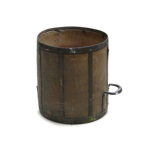 LARGE METAL BOUND WOODEN BUSHEL CORN MEASURE WITH TWO HANDLES 34 CM HIGH