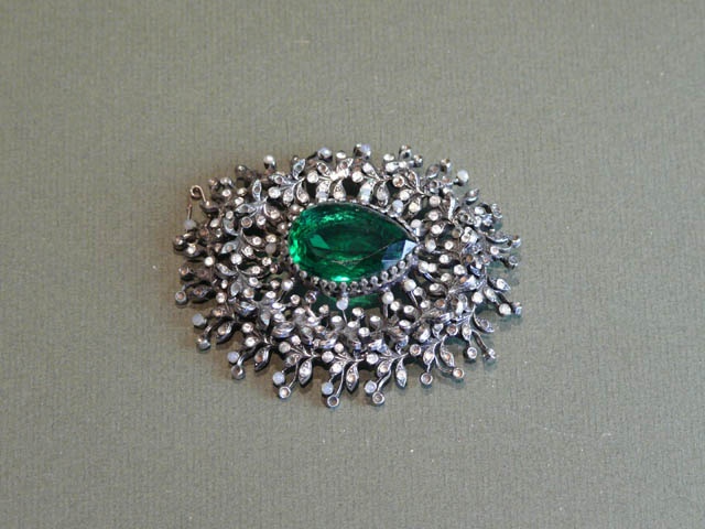 LARGE METAL BROOCH WITH PASTE AND GREEN CENTRE STONE