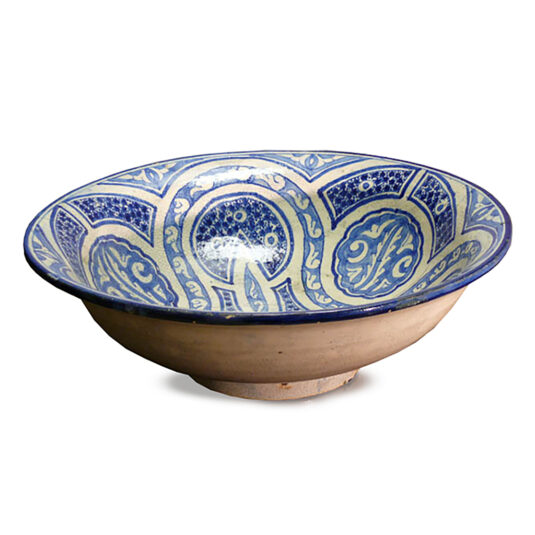 LARGE MOORISH BOWL 19 DIAM. ORNATE BLUE AND WHITE PATTERN
