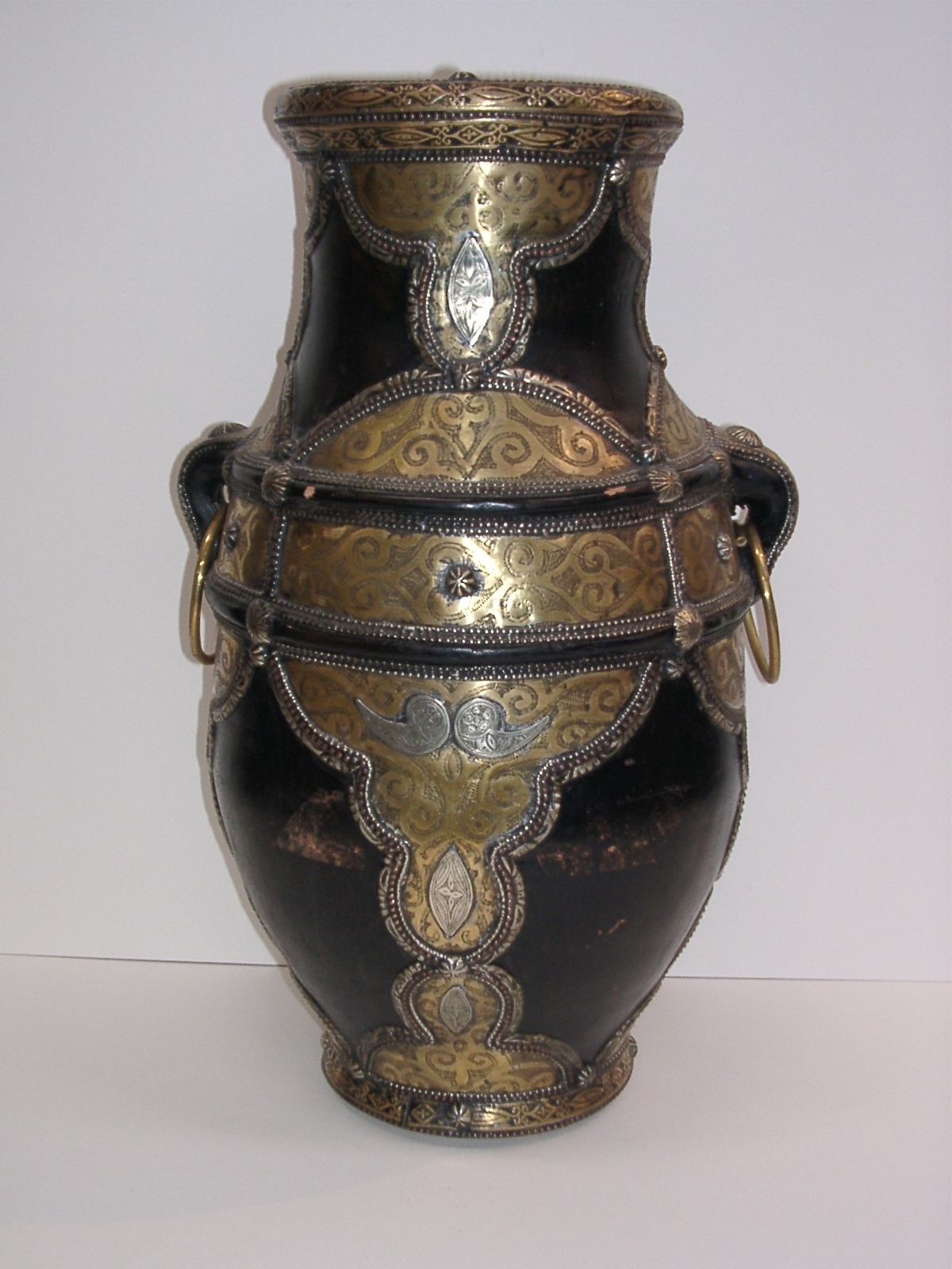 LARGE MOROCCAN BRASS AND SILVER MOUNTED BLACK VASE 20/i HIGH (X2)