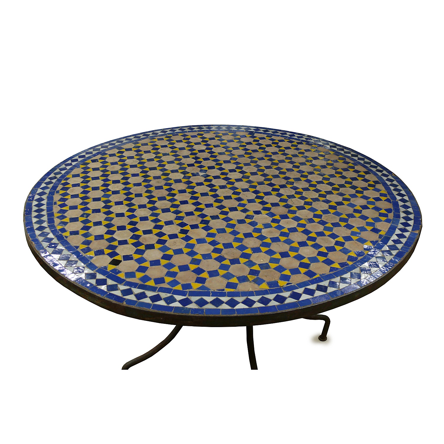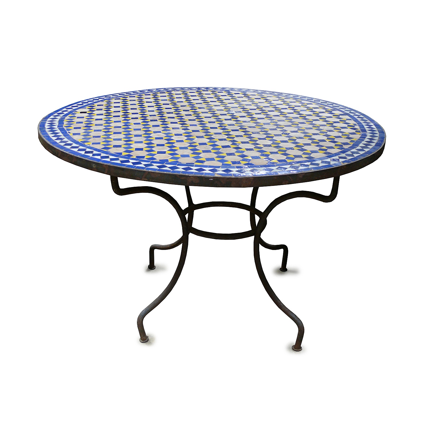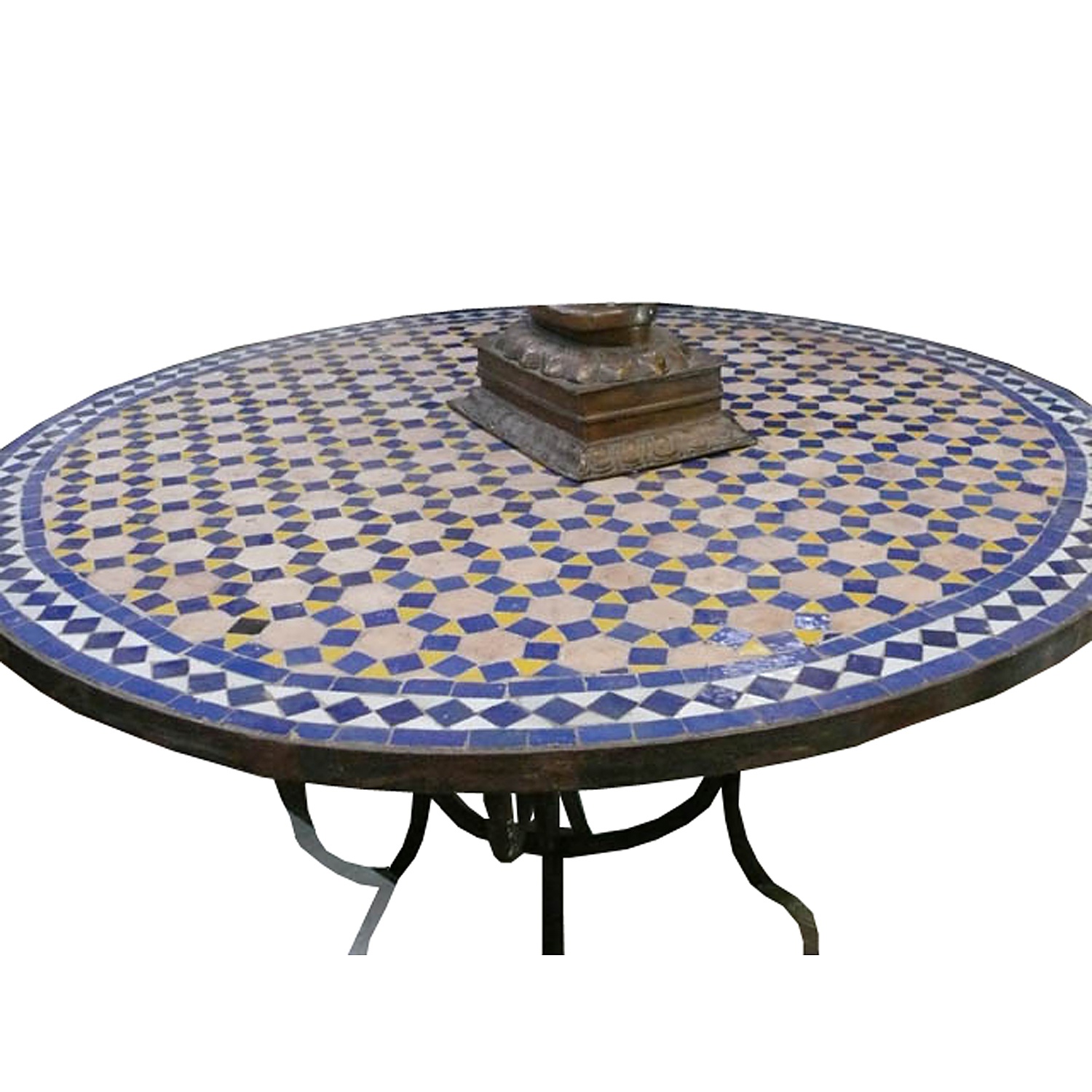 LARGE MOROCCAN CIRCULAR TILE TOP TABLE WITH WROUGHT IRON BASE 81 CM HIGH 122 CM DIAM.