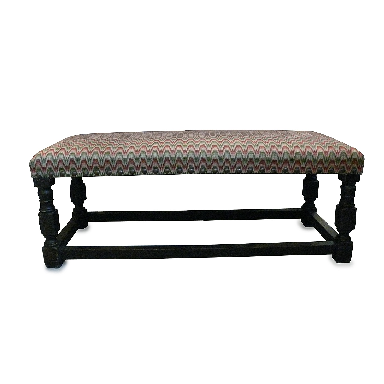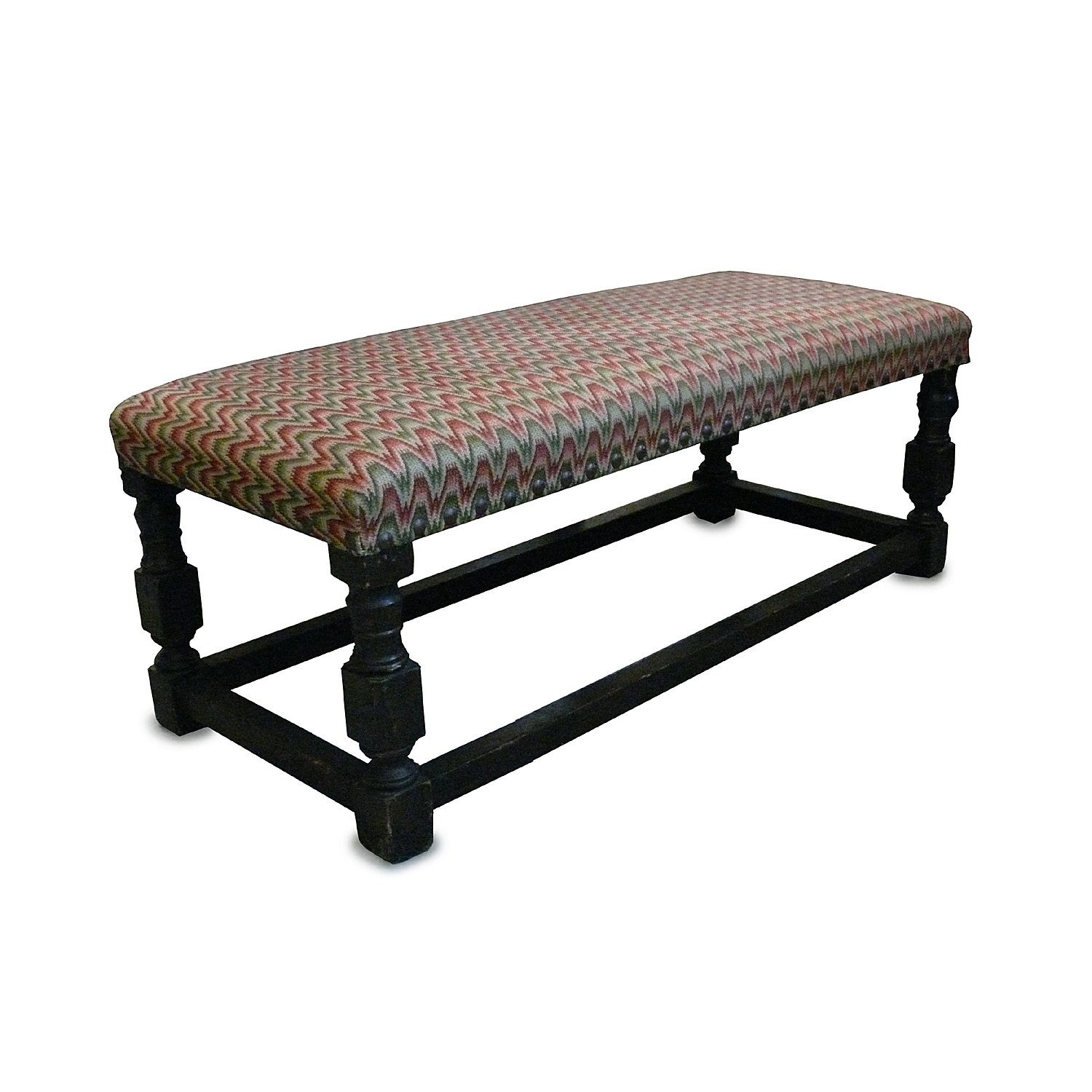 LARGE OAK STOOL TURNED LEGS RED AND GREEN FLAME STITCH UPHOLSTERY 46 CM HIGH 122 CM LONG 52 CM DEEP