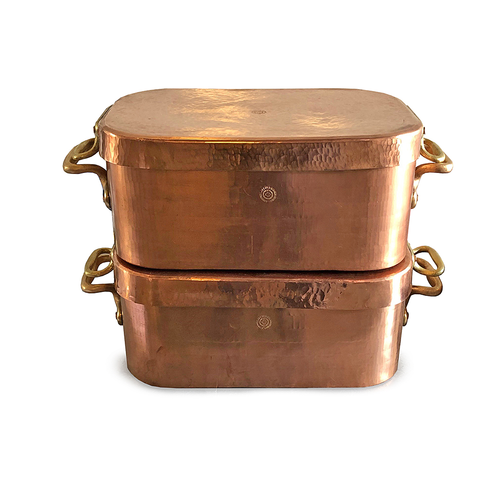 LARGE OBLONG POLISHED COPPER BAKING SAUCEPAN AND LID RELINED L. JAEGGI AND SONS 18 CM HIGH 55 CM LONG 28 CM WIDE (X2)