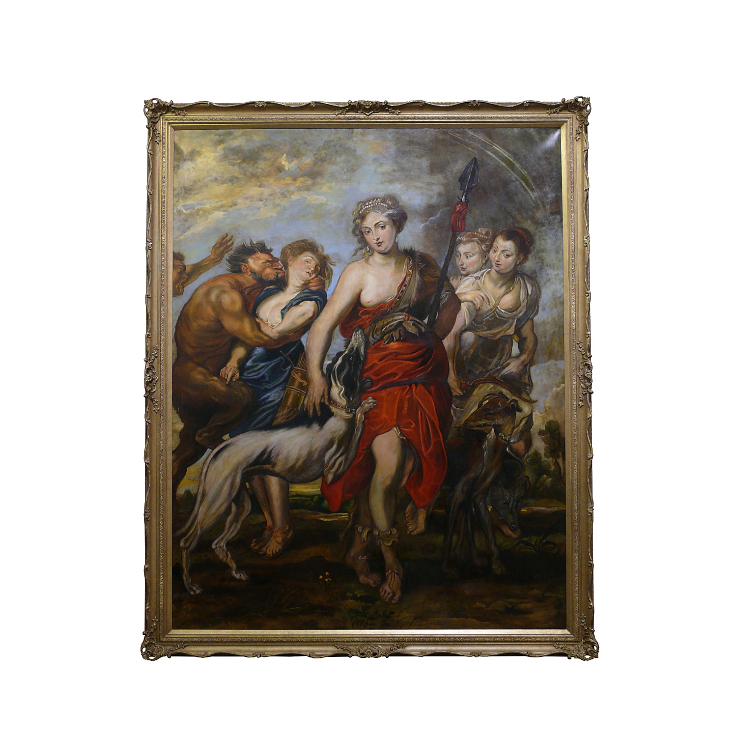 LARGE OIL PAINTING DIANA AND HER NYMPHS ON THE HUNT AFTER PETER PAUL RUBENS (1577-1640) IN A GILT GESSO FRAME 91/i X 71/i