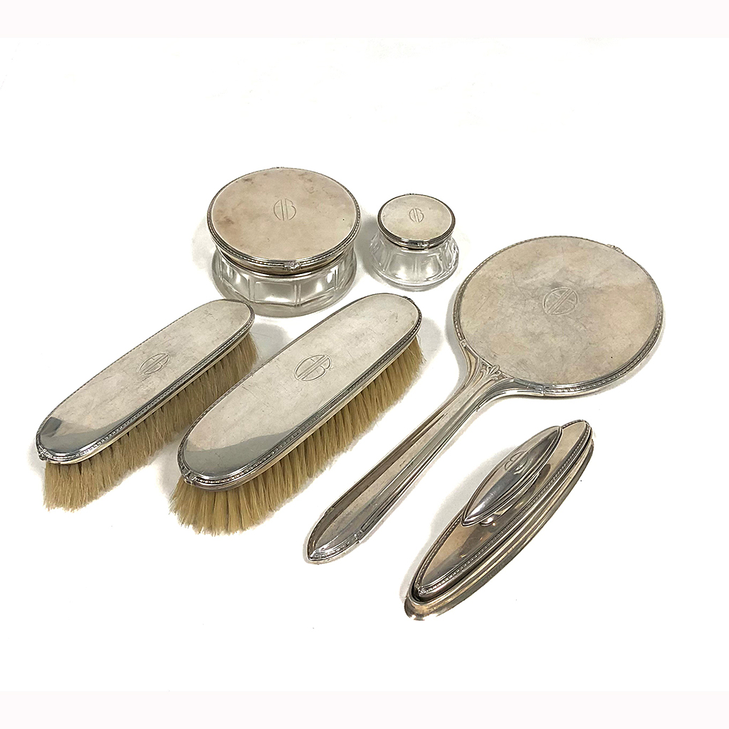 SILVER DRESSING TABLE SET WITH MONOGRAMME COMPRISING 2X GLASS POTS , 1X MIRROR , 2X CLOTHES BRUSHES & 1X NAIL BUFFER