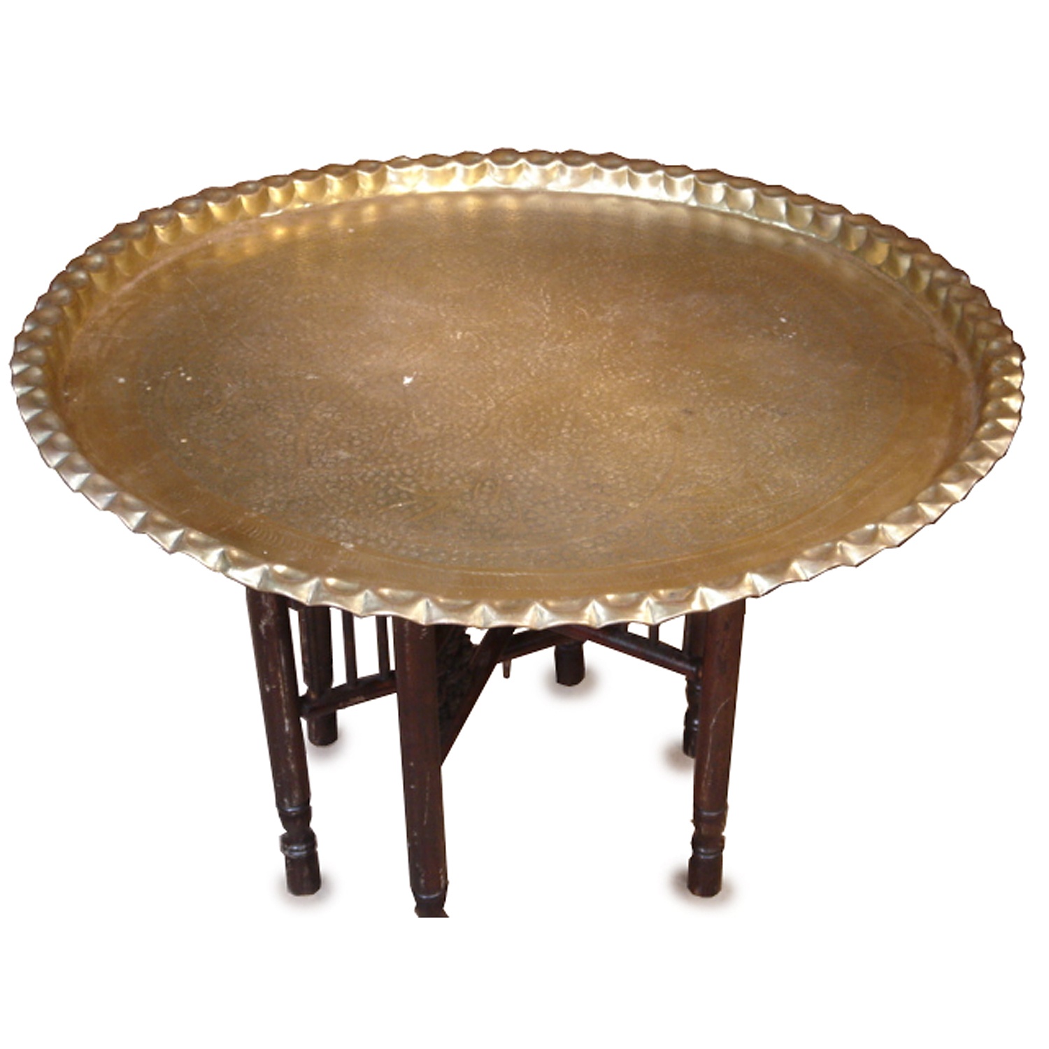 LARGE ORNATE BRASS INDIAN CIRCULAR TRAY TABLE INC BASE 52 CM HIGH 82 CM DIAM (X2)