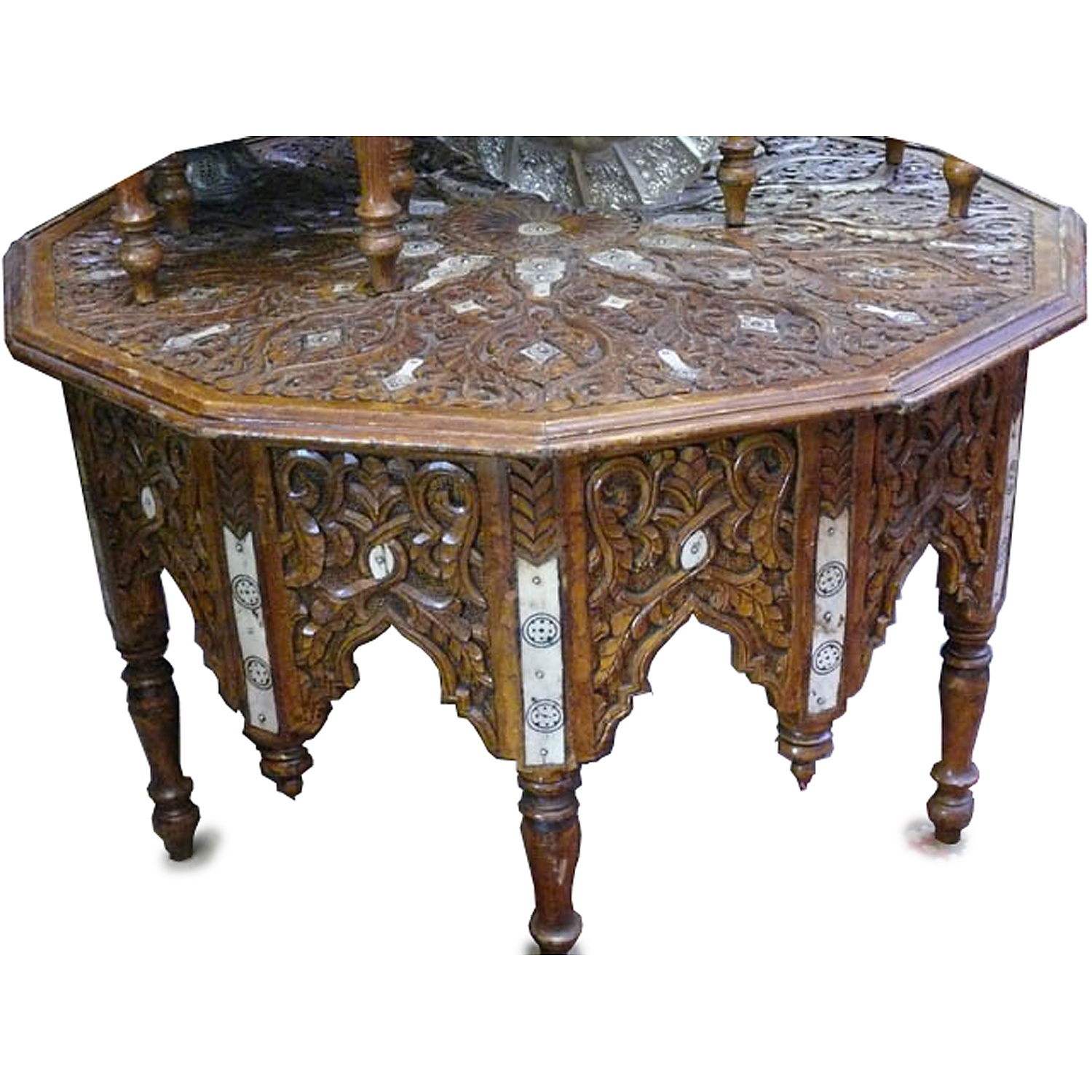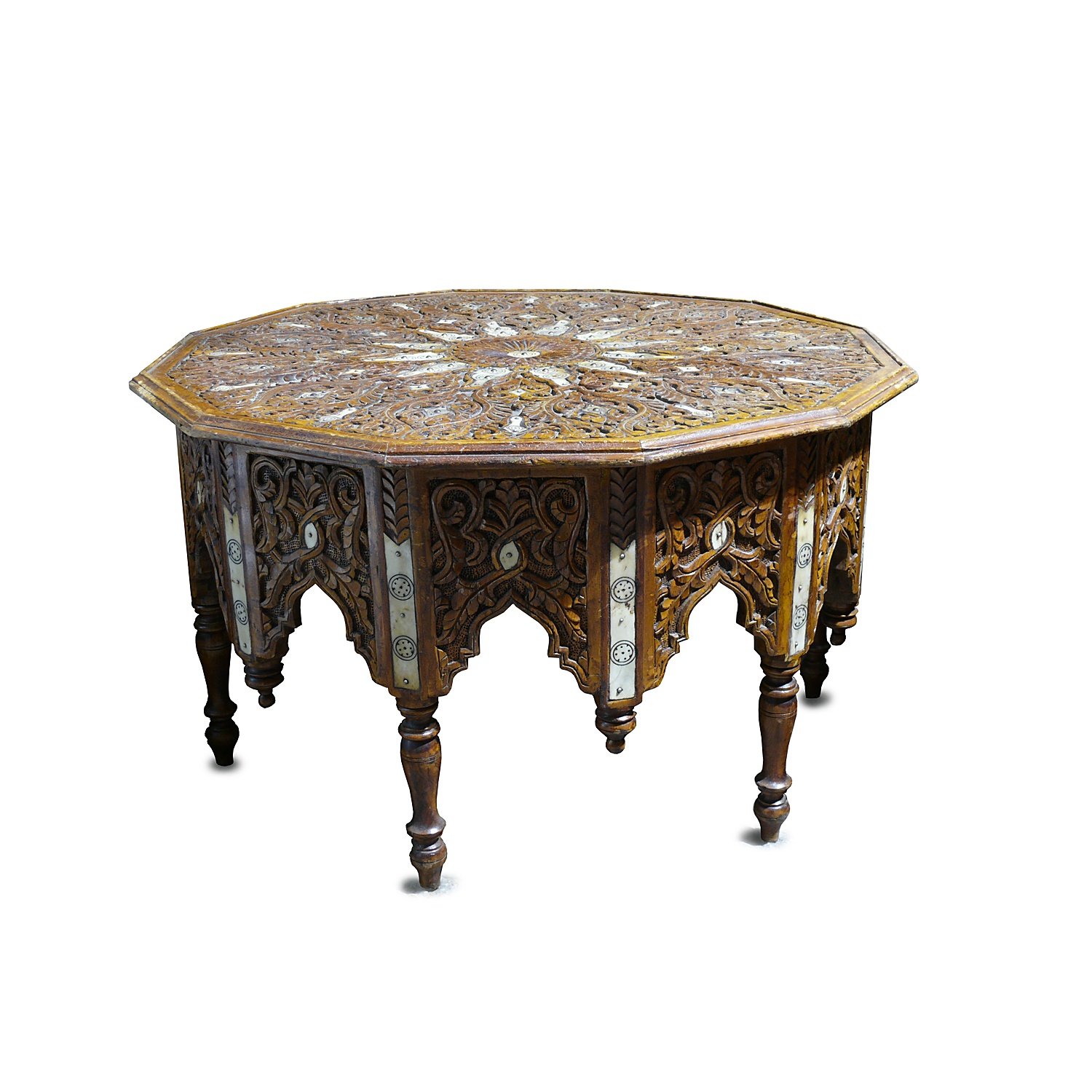 LARGE ORNATE CARVED LIGHTWOOD MOROCCAN LOW TABLE WITH BONE INLAY 59 CM HIGH 106 CM WIDE 106 CM DEEP